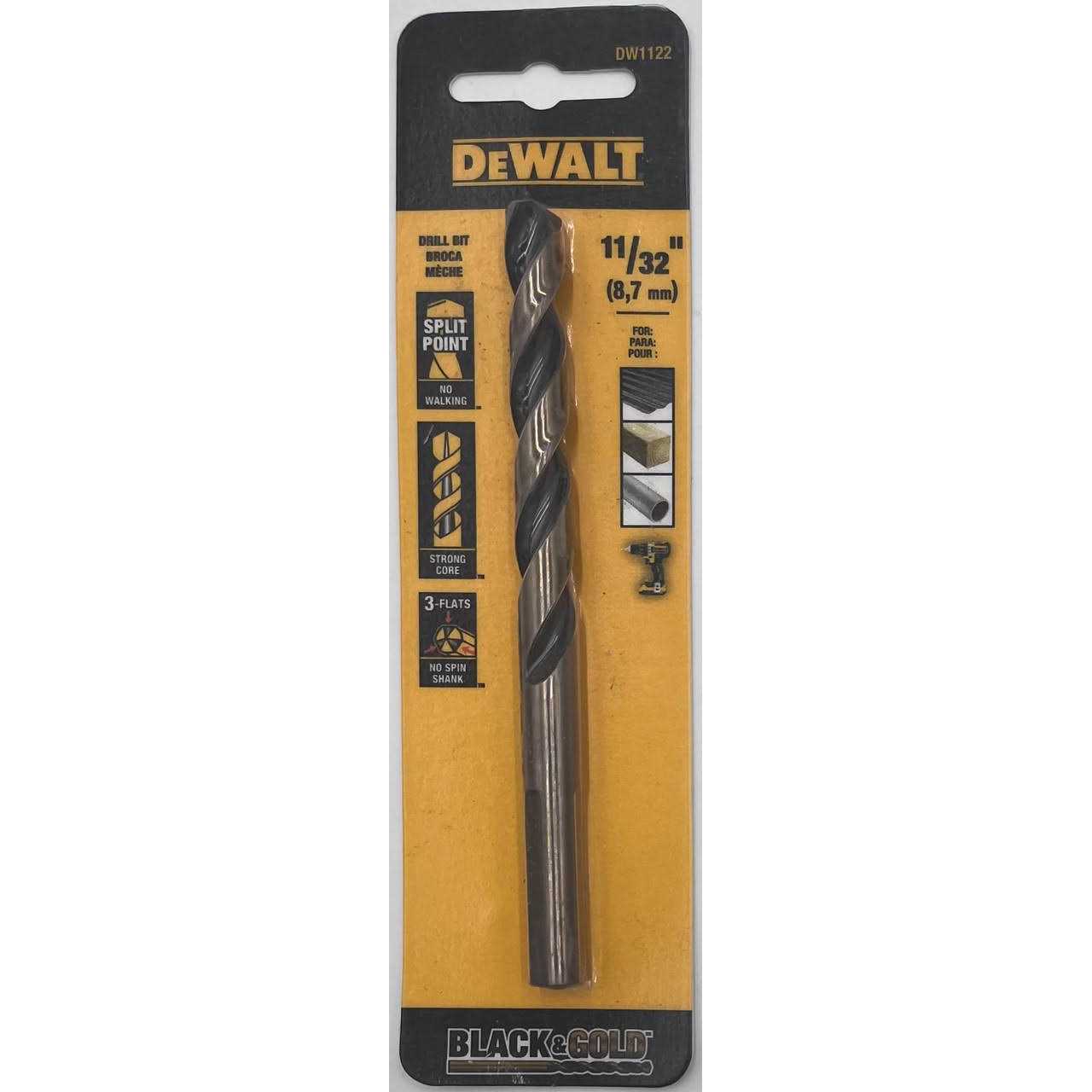 DeWalt DW1122 11/32″ Drill Bit Black Oxide drill bits from DeWalt are ideal for general applications including drilling in non-ferrous metal, wood, and plastic. They have a 135 degree split point for quick start and no walk applications. The parabolic flute design improves chip ejection in metal and wood drilling applications. Because of the wide variety of applications covered, black oxide drill bits are found in most residential and commercial tool boxes.