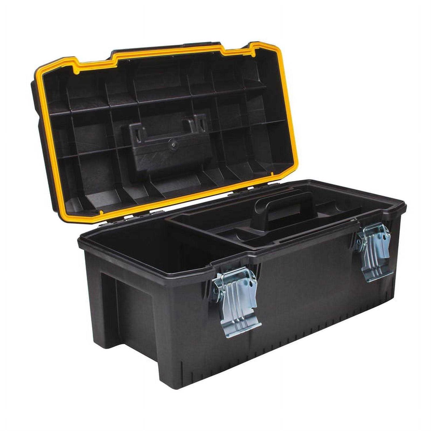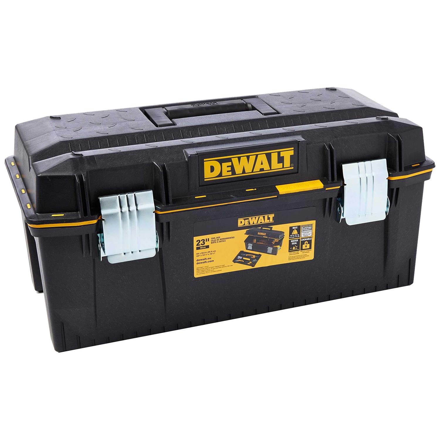 This DeWalt DWST23001 23″W Portable Tool Box is the perfect solution for keeping your tools organised. You will be able to carry your tools around with ease. The primary tool box material is structural foam, which provides a lightweight but sturdy structure. With a 1, 155 cu in storage capacity, this black tool box has ample space for all your tools. Designed to last, it has an overall height and width of 10 1/2 in and 23 in respectively. It also has an inside depth of 20 in., allowing you to store larger items as well as smaller ones. The DeWalt Portable Tool Box is the perfect companion for your next project.