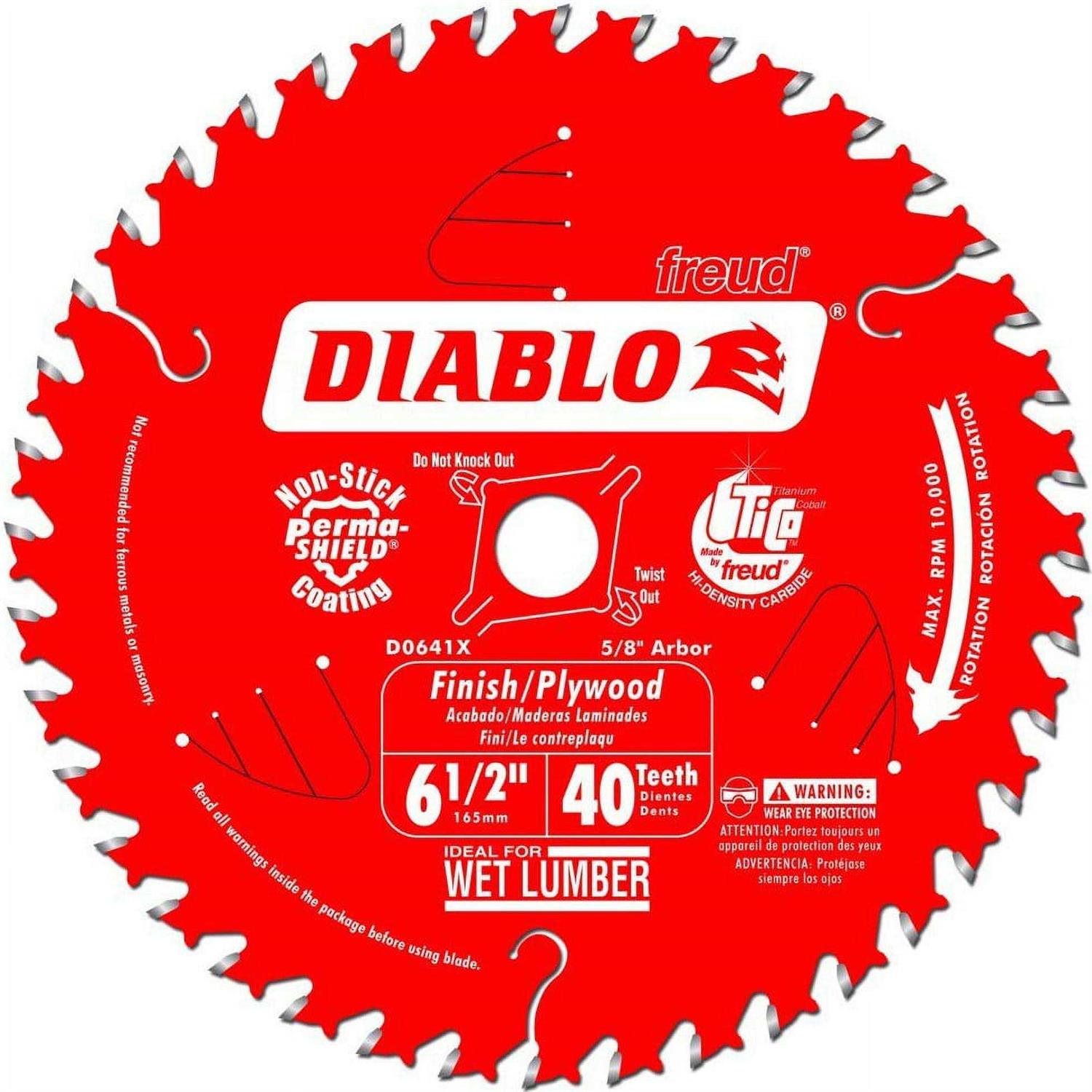 Diablos 6-1/2-inch x 40-Tooth ATB Precision Finishing Saw Blade is ideal for smooth finish crosscuts in hardwood, softwood, or plywood. This thin kerf trim saw blades teeth are made of TiCo Hi-Density carbide for long-lasting durability. Cut from hardcore steel with high precision lasers, the blade’s ultra-thin kerf design provides fast, effortless cuts. A permanent Perma-SHIELD coating keeps this blade free from gumming and corrosion, and laser-cut stabilizer vents reduce vibration and heat buildup for more precise cuts and longer cutting life. TiCo Hi-Density Carbide Teeth Diablo is one of the few manufacturers of woodworking tools in the world that produces its own MicroGrain carbide with titanium, called TiCo a combination of titanium and cobalt. TiCo Hi-Density Carbide tipped teeth provide maximum performance and cutting life. Freud develops different types of carbide for each application to maximize the cutting life and performance of the tool. Build for Accuracy The 1/2-inch laser-cut arbor allows for accurate blade rotation reducing vibration and premature wear. Tri-metal shock-resistant brazing allows the carbide tips to withstand extreme impact for maximum durability. The blade also features laser-cut heat expansion slots that it to expand due to heat build-up keeping the cut true and straight. Reduced Friction A permanent Perma-SHIELD non-stick coating protects the blade from heat and corrosion, reduces friction and pitch buildup. The laser-cut stabilizer vents absorb noise and reduce vibration keeping the blade cool and reducing blade warp. Compatibility This advanced laser-cut blade features a thin kerf, making it ideal for portable and low powered saws on the jobsite. It is suitable for remodeling/demolition and siding/decking projects. This trim saw blade is proven to extend run time on Porter Cable, Saw Boss, and similar trim saws. Age Group: adult.