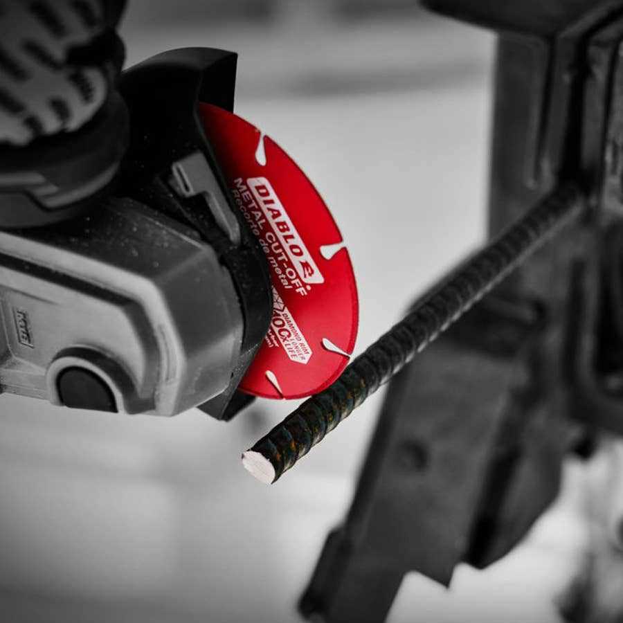 Diablo’s new diamond metal cut-off wheels deliver extreme durability, minimal downtime and increased productivity. These diamond rimmed wheels deliver 100X longer cutting life versus a standard bonded cut-off disc in some of the most intense metal cutting situations. The wheel’s long lasting durability maximizes cutting even in extreme applications such as rebar, angle iron, cast iron and steel bar. Diablo’s diamond metal cut-off wheels not only provide long lasting cutting life, durability and control, but they also allow for a safer cutting experience. For use on angle grinders with a max RPM of 8,450 Ideal for cutting rebar, angle iron, cast iron and steel bar Diamond rimmed wheels for up to 100x longer cutting life Diamond rimmed wheels deliver up to 100X longer cutting life and durability when compared to 1-standard bonded cut-off disc Advanced electro-plating process for even distribution of diamond abrasive cutting edge Maintains cutting diameter for consistent cutting results Diamond technology is safer to use versus bonded discs by providing more control, less sparks and less dust Diamond wheels do not shatter or break when dropped Ideal for cutting rebar, angle iron, cast iron and steel bar For use on angle grinders with a max RPM of 8,450 7/8 in. arbor Bushing included for conversion to 5/8 in. arbor New Diablo Diamond Metal Cut-Off Disc features Make consistent cutting easier with the help of this reasonably priced Diablo Diamond Wheel for Metal Cutting. Provides durability.