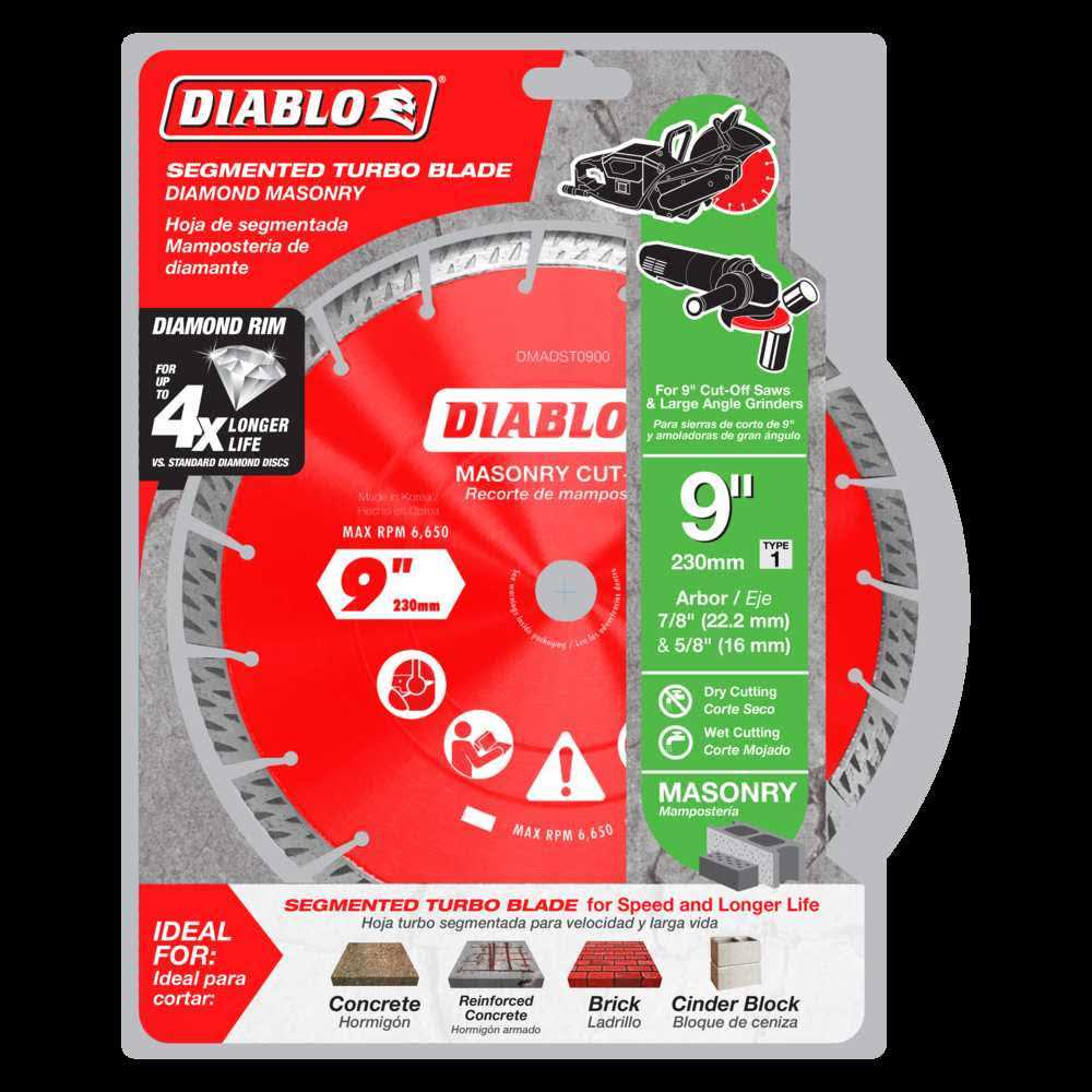 DIABLO’s diamond segmented turbo rim masonry cut-off discs provide extreme durability faster cuts and longer life in concrete concrete with rebar brick and cinder block. These diamond rimmed discs deliver up to 30% faster cuts versus standard diamond cut-off discs. The disc’s industrial-grade diamonds with hardened disc body delivers lasting durability and maximizes cutting quality in hardened materials even in extreme applications.