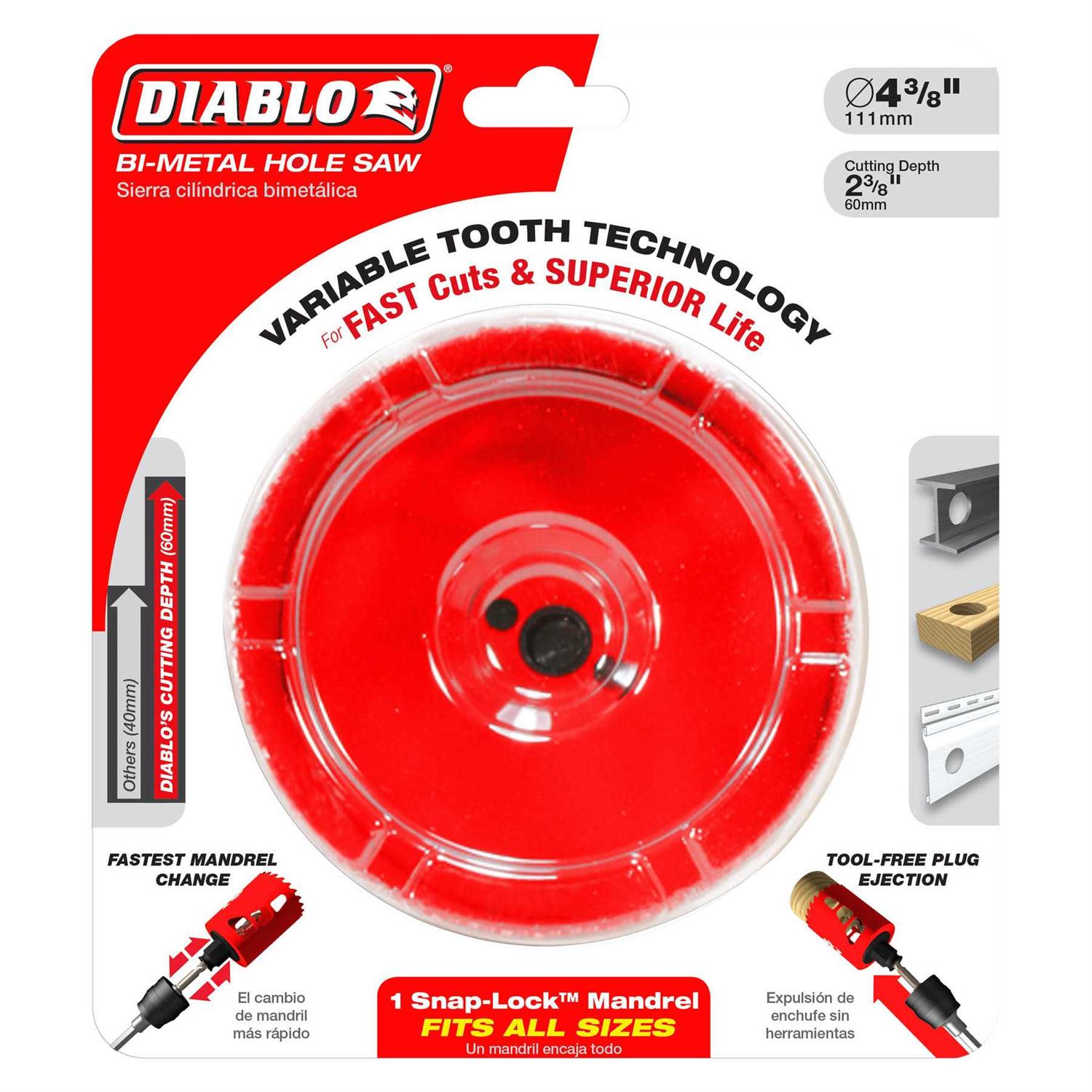 Unlike anything on the market, Diablo hole saw system and mandrel design simplify the attachment process for fast and efficient hole saw mounting. These radical new hole saws provide ultimate cutting length to bore deeper holes in a single pass, tool-free plug ejection and variable tooth design for faster cuts. Snap-Lock mandrel system for a quick and easy change with no down time. Snap-Lock mandrel system for a quick and easy change with no down time. Tool-free plug ejection for fast material removal. 2-3/8 in cutting depth for 40% deeper holes in one pass and increased productivity. One-size fits all mandrel fits all Diablo hole saws. Variable tooth design provides faster cuts with less vibration.