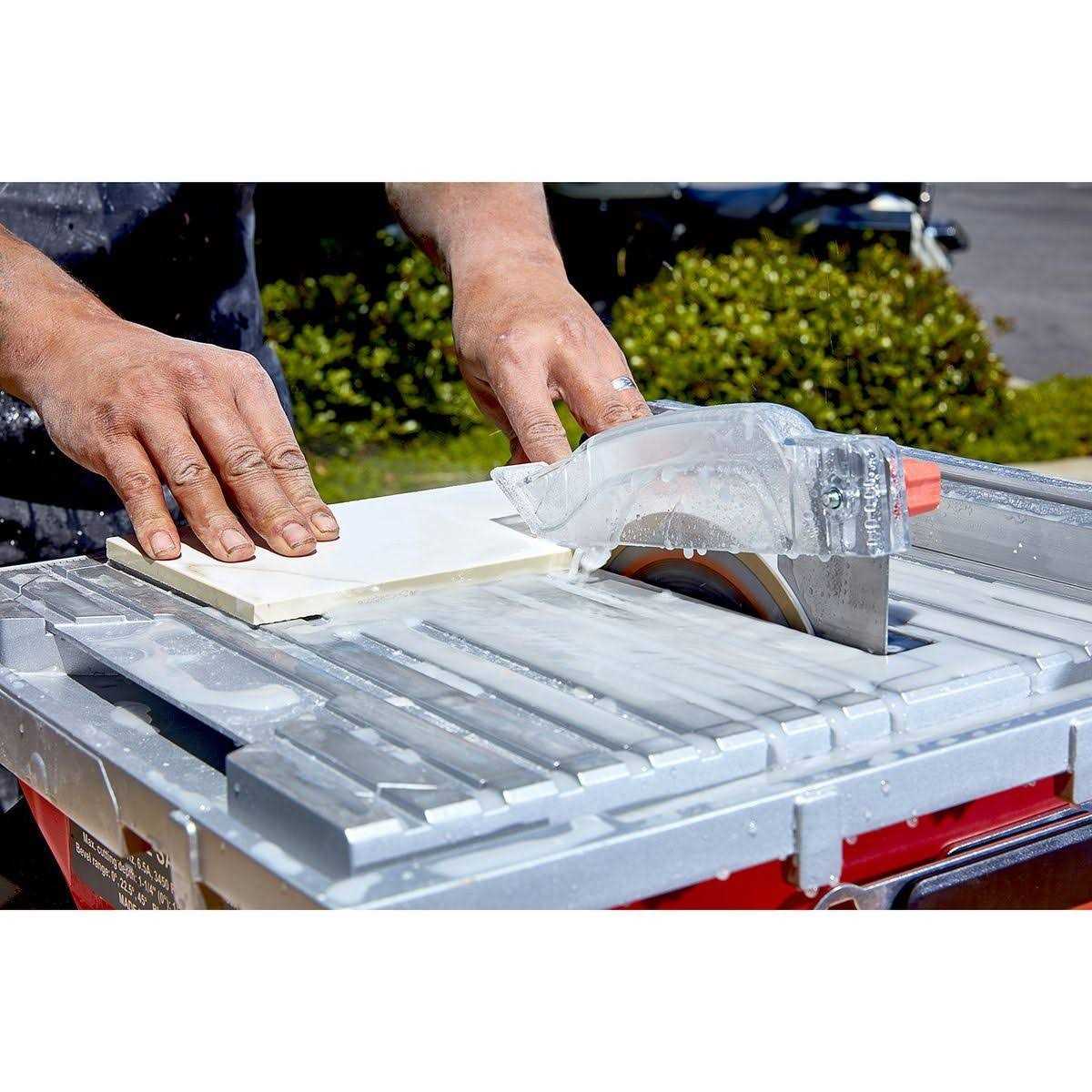 Built for the professional, the DIAMONDBACK 7 in. Table Top Wet Tile Saw produces 3500 RPM capable of powering through the toughest porcelain, stone and masonry up to 1-1/4 in. thick. The precision-machined aluminum table supports a rip capacity of 18 in. and a diagonal capacity of 12 in. The heavy duty aluminum rip fence locks securely onto the table to ensure straight and accurate cuts every time. The high capacity water tray and integrated splash hood keeps the blade wet, keeps your cuts clean and the rest of the workpiece dry. The no-mar rubber feet protect the work surface and the built-in carry handles make transporting the saw easy.