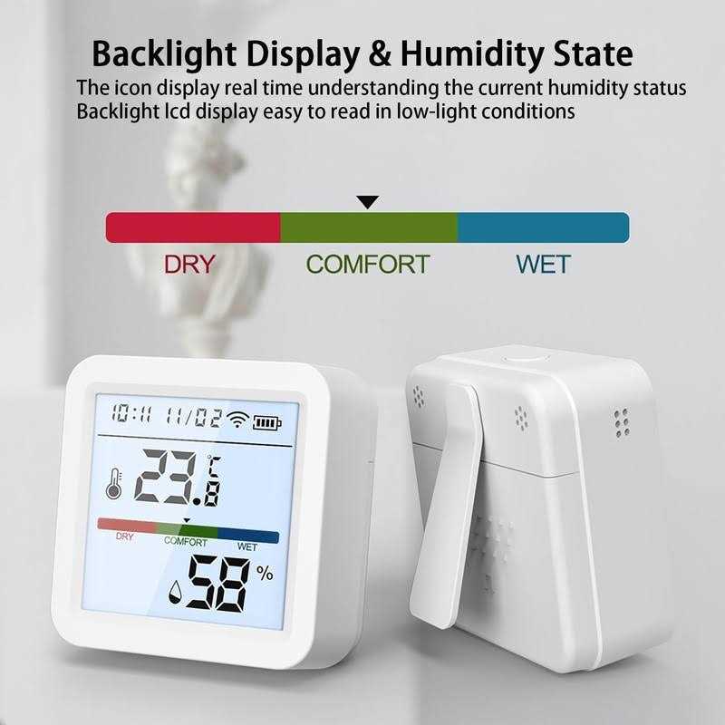 Tuya WIFI Temperature and Humidity Monitor APP Name:Tuya Smart/Smart Life With backlight Support Voice Control By Amazon – Alexa/Google Assistant Battery: DC4.5VAAA3 WIFI: 24GHz.802.11b/g/n Working humidity: 0-99.9%RH Workingtemperature:-10C-+55°C Temperature – Accuracy +0.6C (adjustable) Humidity – Accuracy:±6%RH(adjustable Temperature/Humidityreport cycle:120min(adjustable) Low-battery remind function Support Temperature/Humidity – Alarm Push Product size: 54*54*25mm Weight: 63g