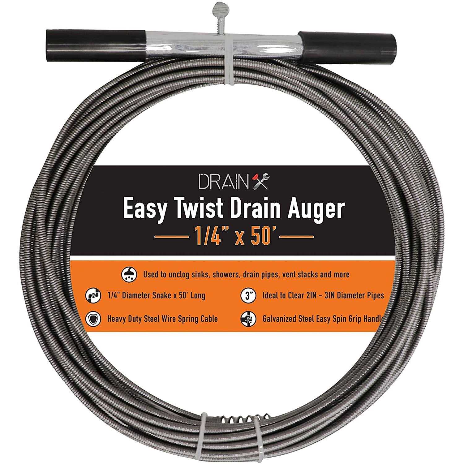 Heavy duty galvanized steel wire spring cable for maximum flexibility and reach Package includes cable and handle bar, stretch fit protective grip padded gloves and professional storage bag DrainX manufactures a variety of quality drain cleaning solutions for both the do it yourself-er and the professional. 50 FT 3/8 Inch diameter Drainx Easy Twist augers, essential plumbing kit is flexible and helps clean up stubborn clogs Package includes cable and handle bar, stretch fit protective grip padded gloves and professional storage bag 3/8 inch diameter leader suitable for 2”-3” diameter pipes or openings Used to unclog sinks, showers, drain pipes, vent stacks and more. Heavy duty galvanized steel wire spring cable for maximum flexibility and reach DrainX manufactures a variety of quality drain cleaning solutions for both the do it yourself-er and the professional. Register your product for extended protection.