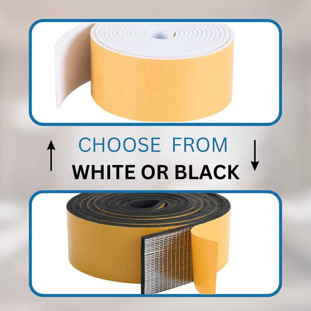 WEATHERSTRIP TAPE: Feel a draft? Our window stripping seal strip could be the insulation solution you’ve been looking for. Available in black or white, this foam sealant can be used as weatherstrip seal for windows, car doors, the garage door & more. MULTI APPLICATION: A multipurpose adhesive weatherstrip, our multiuse self adhesive rubber weather stripping can be used for door and window seal, auto, furniture, handcraft, toys etc. STRONG ADHESION: Easily weatherproof a front door, winterize windows, home appliances, plumbing components or a vehicle. This adhesive weather stripping supports super strength adhesion to prevent lifting. Stick it in doorjambs, open gaps or edges. THICK, INSULATIVE: Made out of high density closed cell EVA foam, our weather stripping tape is extremely durable. Easy to cut & customize, the weatherstrip seals out cold air & blocks out heat to help reduce energy bills in summer & winter. MULTIPURPOSE HIGH DENSITY INSULATION TAPE Strong non-degumming adhesive backing; Waterproof, weather resistance, moisture resistance and chemical resistance; It has multiple features that make it the ideal insulation tape for use in any commercial, industrial or domestic use; It can provide an airtight seal for your windows, doors, repair vents, insulate pipes and cover leaks. APPLICATION: Widely used in various doors and windows, furniture, electrical cabinets, cars, speakers, toys, etc. The foam seal strip also can be used in electronic products, household appliances, hardware tools, etc. EASY TO INSTALL Clean the surface Mark the same height as the place you need, then cut the excess tape Peel off the backing adhesive Apply the seal tape to the place you need Be sure to allow enough time for the adhesive to set.