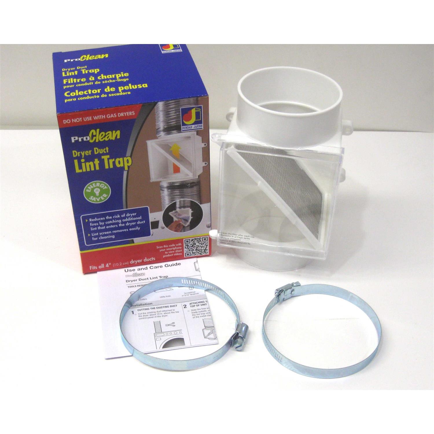 Reduce the risk of dryer fire by keeping the dryer duct clean and free of lint. Acts as a secondary lint trap for electric clothes dryers – not intended for gas dryers. Fits all 4 inch dryer ducts. Installs easily onto the dryer transition duct collecting additional lint to help eliminate unwanted and excess lint within the duct. Air passes easily and without obstruction, allowing the dryer to run more smoothly and efficiently. Clear door gives unobstructed view of lint screen. Includes: 1 lint trap unit, 1 removable lint trap screen, (2) 4 inch metal clamps, and installation instructions.