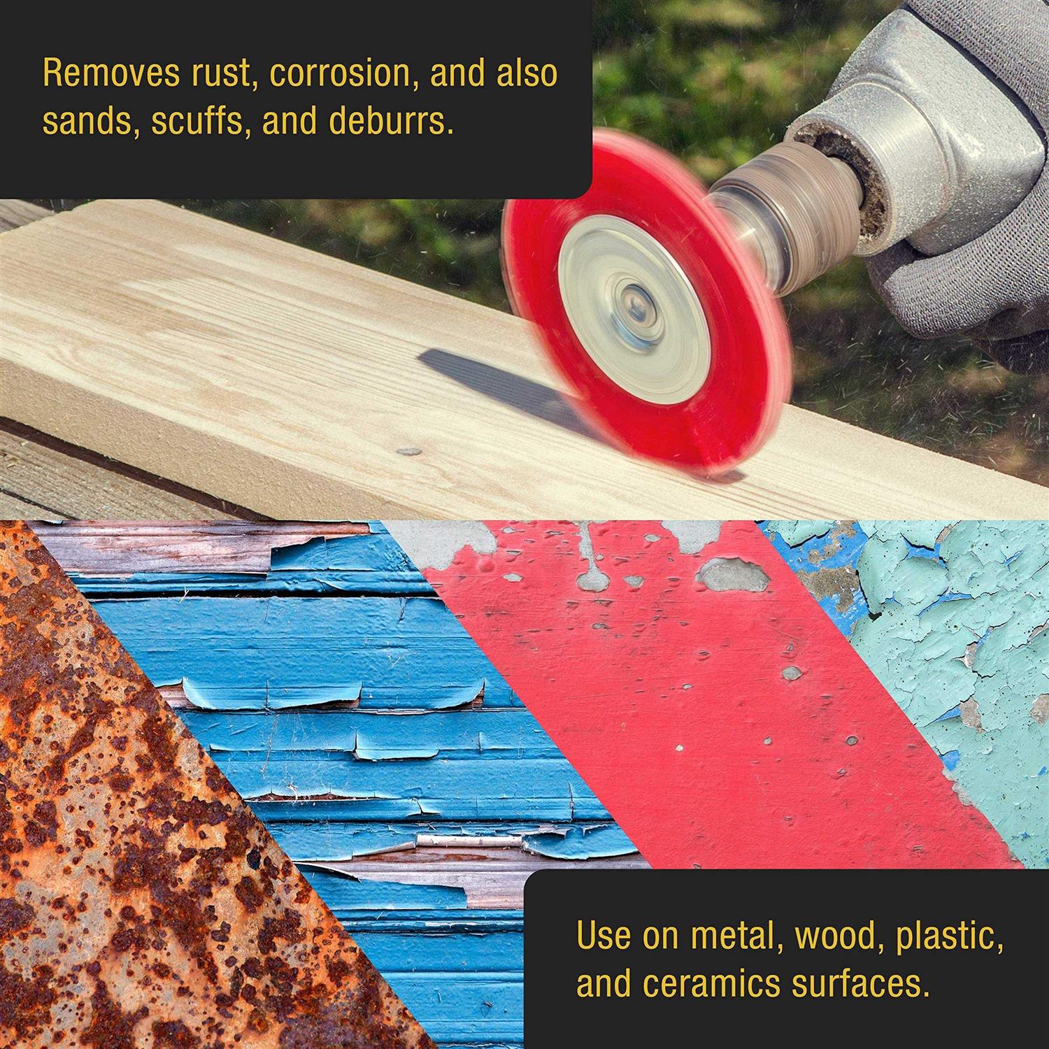 Durable abrading wheels and brushes with coarse abrasive grit embedded into the nylon brush strands, so they quickly and easily remove rust, corrosion, and they also sand, scuff, and deburr metal, wood, plastic, and ceramic surfaces. The ideal abrasive cup brush to use for cleaning and prepping surfaces for sprayable truck bed liner coatings. The wheels and brushes quickly scuff and strip metal surfaces with the abrasive nylon strands without causing any sparks that metal brushes do. They also leave the surface with a fine enough scuff scratch that a primer or truck bed liner coating can go directly over it. These wheels and brushes are designed to be effective and will last many times longer than those with wire brushes. Because, as the wheels and brushes nylon strands wear down, they expose fresh embedded abrasive grit that continues to provide consistent clean and fast scuffing and rust removal.