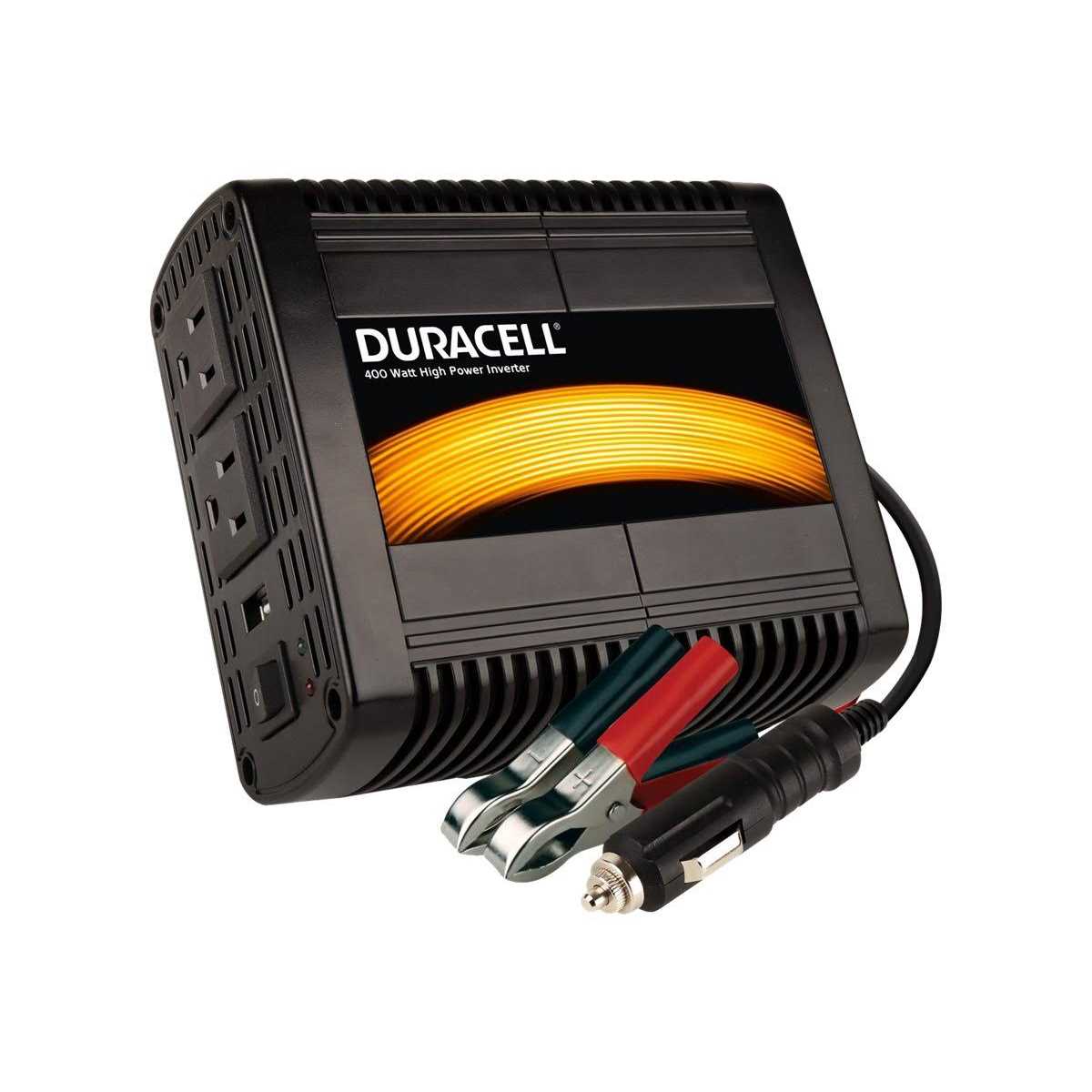 The Duracell 400 Watt High Power Inverter, one of Duracell’s newest releases boasts two 3-prong AC outlets and 1 USB port. It is capable of powering most 115V AC products and its 2.1 Amp USB port efficiently charges your smartphones and tablets. A range of items can be used with the included Power plug and Battery clamp cables. The power plug connects to your cars power socket for everyday use with items under 175 watts. The Battery clamp cable connects directly to your car battery for high power applications over 175 watts.