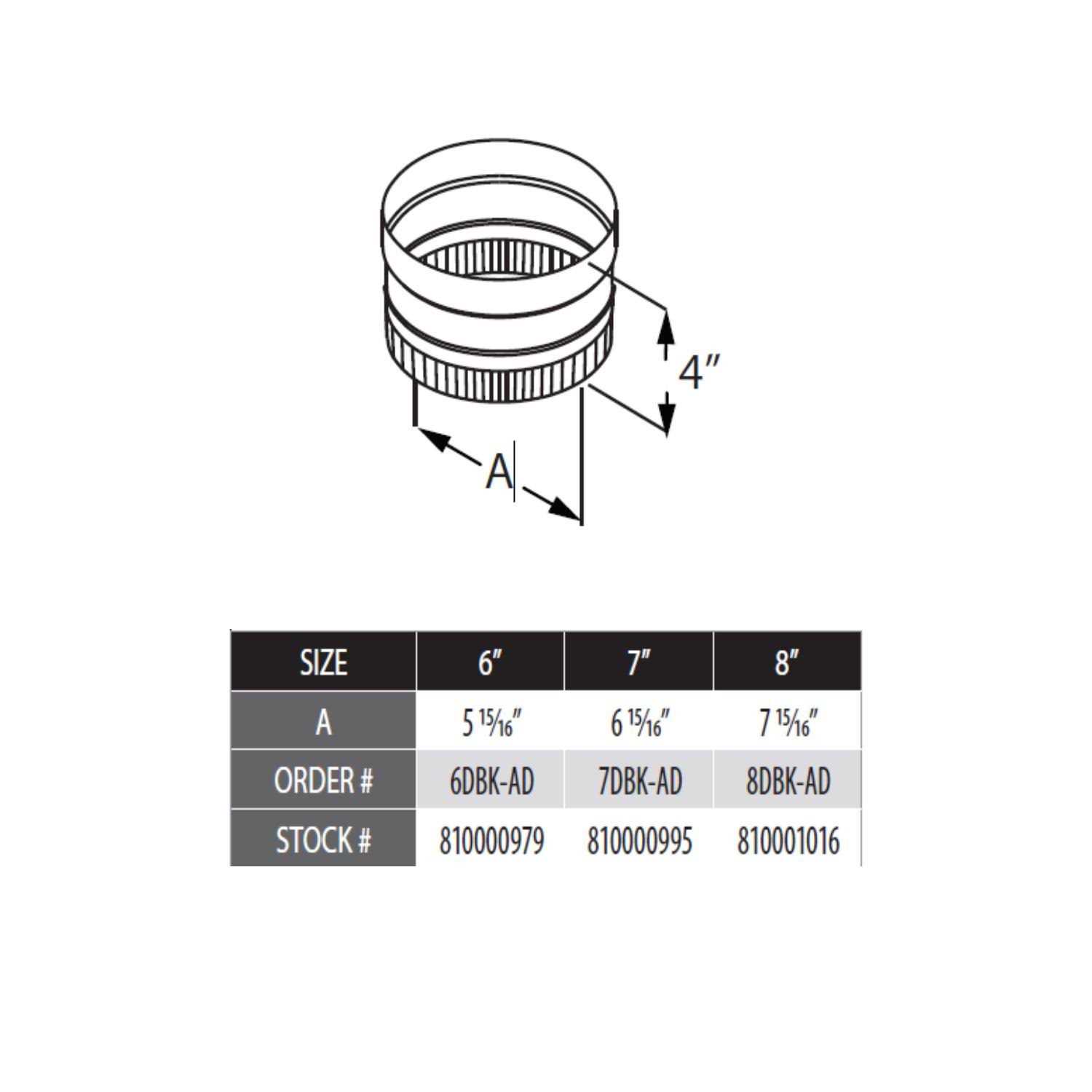 The DuraVent 8DBK-AD DuraBlack Stovetop Adapter, 8-Inch Diameter provides a premium product for use with the DuraBlack chimney system. This component adapts a DuraBlack stovepipe to appliance flue outlets. DuraBlack offers an economical, drip free, single-wall stovepipe. Built to DuraVent’s high standards, DuraBlack is constructed with die-formed end fittings. Adjustable pipe lengths also eliminate the need for cutting and crimping. Available in 24-gauge lock-seam, 22-guage stainless steel and heavy-duty 22-guage welded seam, DuraBlack offers a durable venting option for the home.