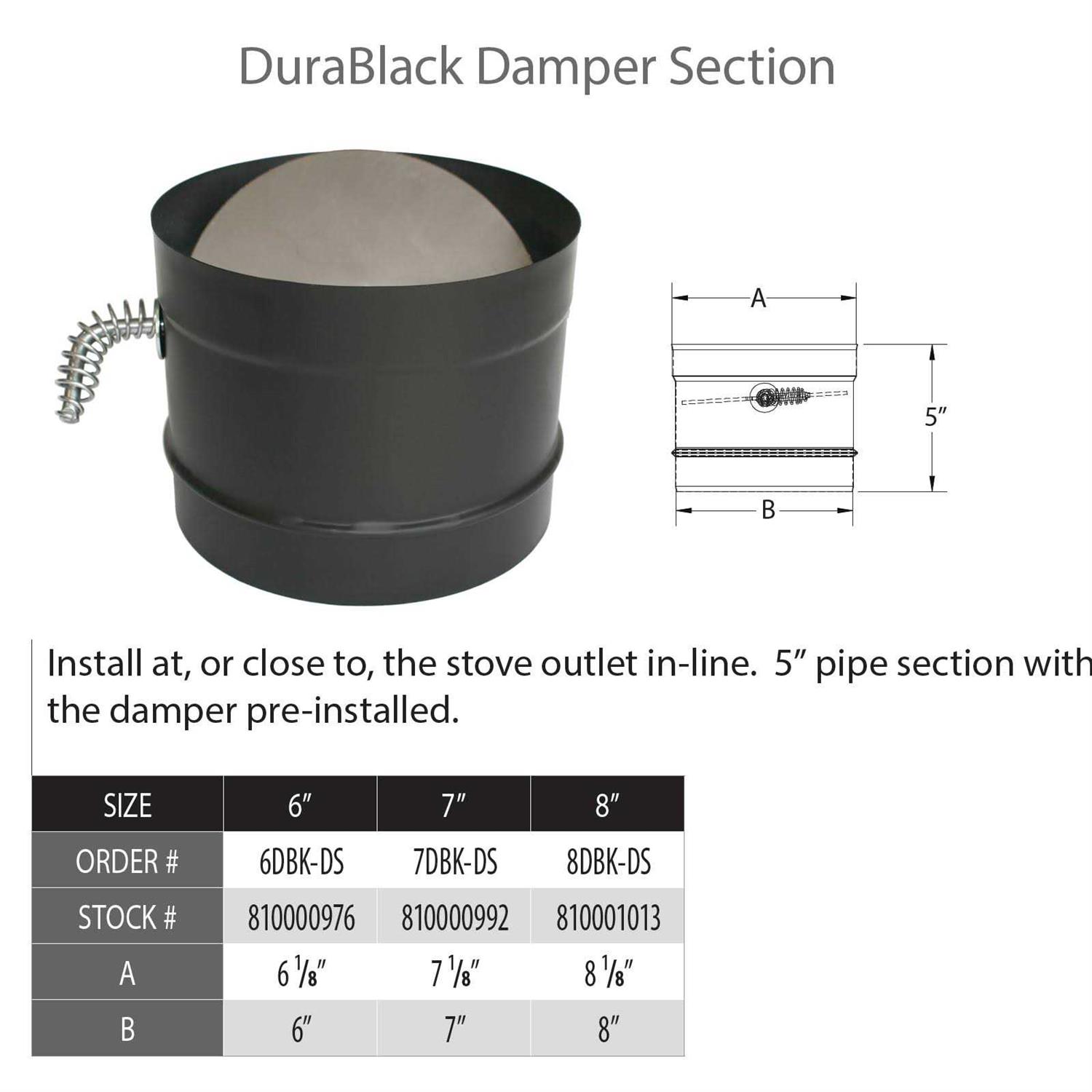 The DuraVent 8DBK-DS DuraBlack Damper Section, 8-Inch Diameter provides a premium product for use with the DuraBlack chimney system. This component installs at or close to a stove outlet in-line and features a 5-inch pipe section with a pre-installed damper. DuraBlack offers an economical, drip free, single-wall stovepipe. Built to DuraVent’s high standards, DuraBlack is constructed with die-formed end fittings. Adjustable pipe lengths also eliminate the need for cutting and crimping. Available in 24-gauge lock-seam, 22-guage stainless steel and heavy-duty 22-guage welded seam, DuraBlack offers a durable venting option for the home.