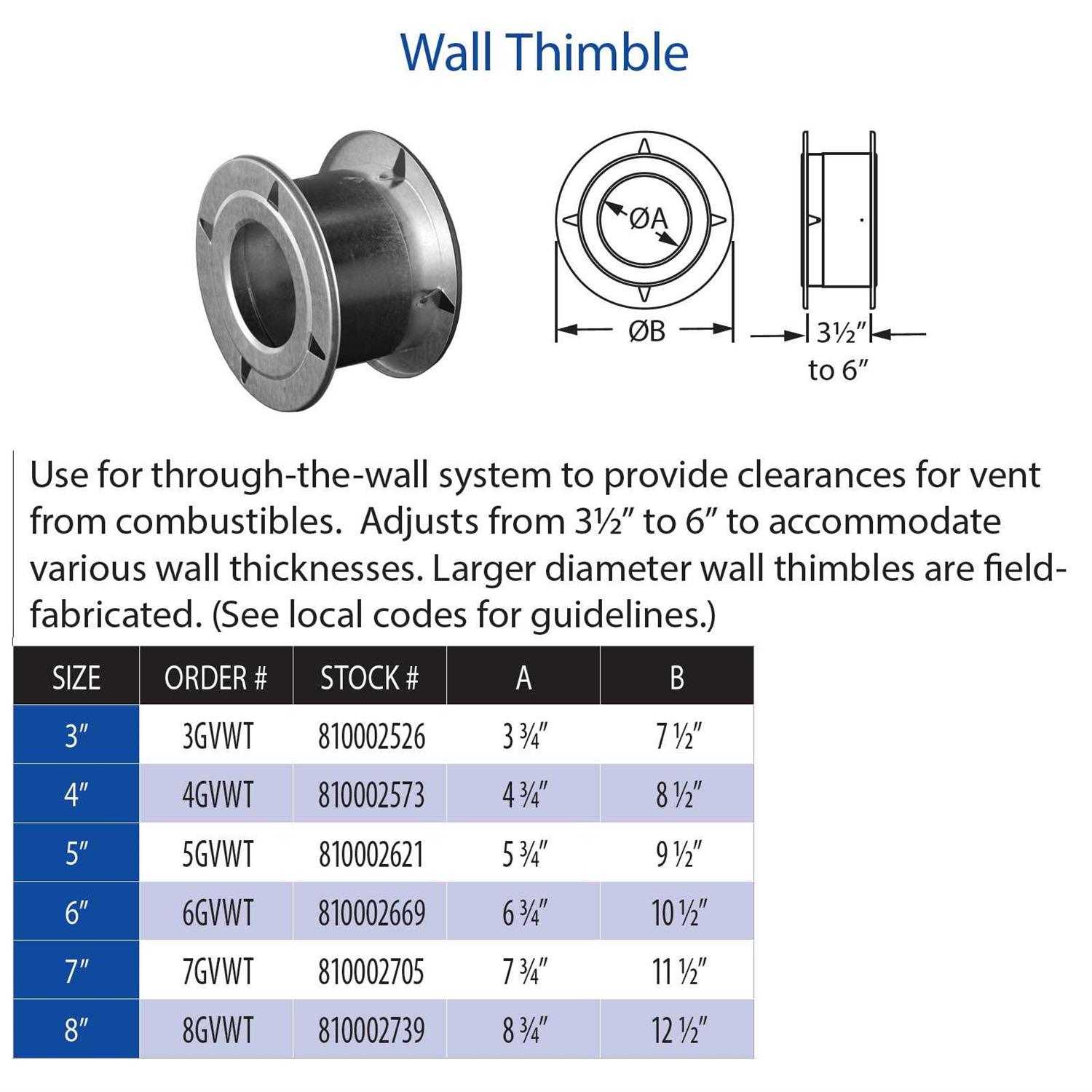 This Aluminum Wall Thimble with 4 Inch Inner Diameter from the Round Gas Vent series is a Type B gas component and consists of the duralock system for a tight seal. Use for through-the-wall system to provide clearances for vent from combustibles. Adjusts from 3.5 inch to 6 inch to accommodate various wall thicknesses. Larger diameter wall thimbles are field fabricated. Features Double Wall Construction UL ListedSpecifications Collection: Round Gas Vent Fuel Type: Gas, Liquid Propane Inner Diameter: 4 inch Width: 8.5 inch Adjusts From: 3.5 inch to 6 inch Depth: 3.5, 6 inch Inner Pipe Gauge: 28 Outer Pipe Gauge: 28 Pipe Inside Diameter: 4 inch Configuration: Wall Thimble Inner Pipe Material: Aluminum Material: Aluminum Outer Pipe Material: Galvanized Steel Pipe Class: Type B Pipe Shape: Round Vent Construction: Double Wall Fuel Type: Gas Approved for Commercial Use: No Certifications: UL – SKU: LIND4727