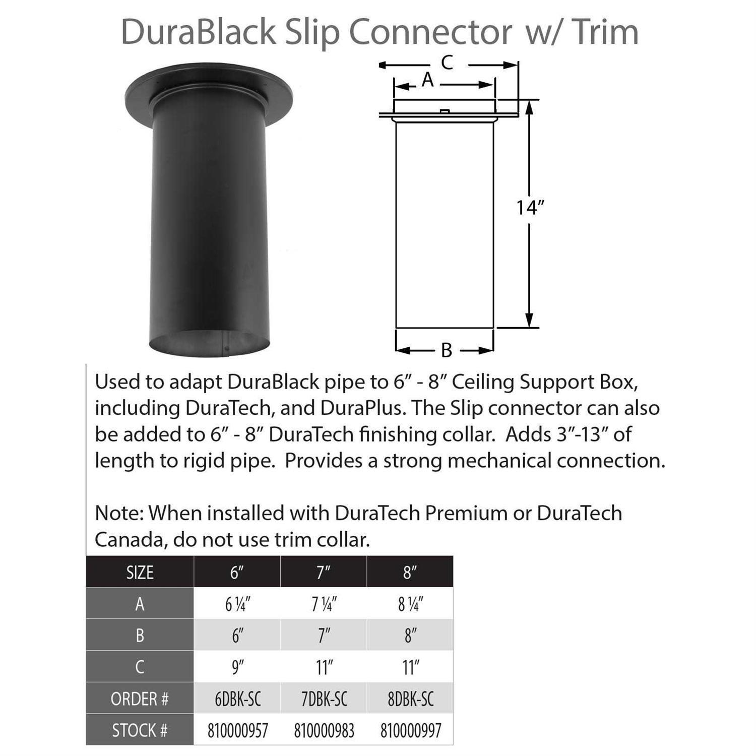The DuraVent 6DBK-SC DuraBlack Slip Connector with Trim, 6-Inch Diameter provides a premium product for use with the DuraBlack chimney system. This connector adapts a DuraBlack pipe to a 6- to 8-inch ceiling support box, including DuraTech, DuraPlus, and DuraTech Premium Systems and adds 3 to 13 inches of length to rigid pipe. This slip connector can also be added to 6- to 8-inch DuraTech finishing collars. DuraBlack offers an economical, drip free, single-wall stovepipe. Built to DuraVent’s high standards, DuraBlack is constructed with die-formed end fittings. Adjustable pipe lengths also eliminate the need for cutting and crimping. Available in 24-gauge lock-seam, 22-guage stainless steel and heavy-duty 22-guage welded seam, DuraBlack offers a durable venting option for the home.
