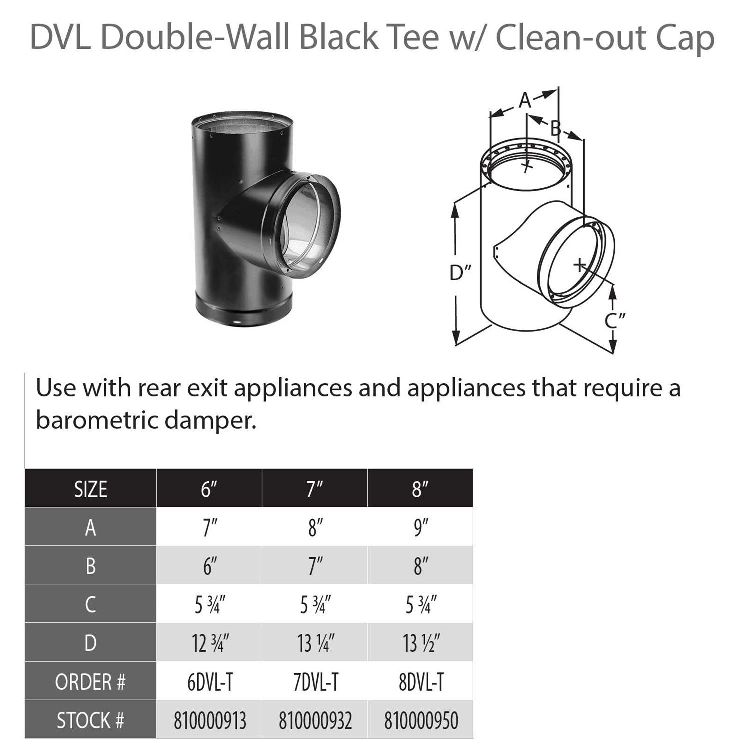 The DuraVent 7DVL-T double-wall black tee with clean-out cap is installed in a typical venting system. This black tee with clean-out cap is with rear exit appliances and other appliances that need a barometric damper. The double-wall stove pipe from the DuraVent DVL collection completes the venting system when with one of DuraVents chimney products like DuraTech or DuraPlus. The double-wall pipe enhances stove performance by preserving high-temperature flue gas for a strong and steady draft. The stainless steel inner wall allows the flue to heat up faster and keep the temperature hot for a longer period of time. It also minimizes the development of creosote. The double-wall pipe comes with adjustable lengths which eliminates cutting or pleating. The double-wall pipes from the DuraVents DVL series have a similar longevity as the chimney. DuraVent is trusted in the venting industry through its constant development of breakthroughs in commodity improvement and development.