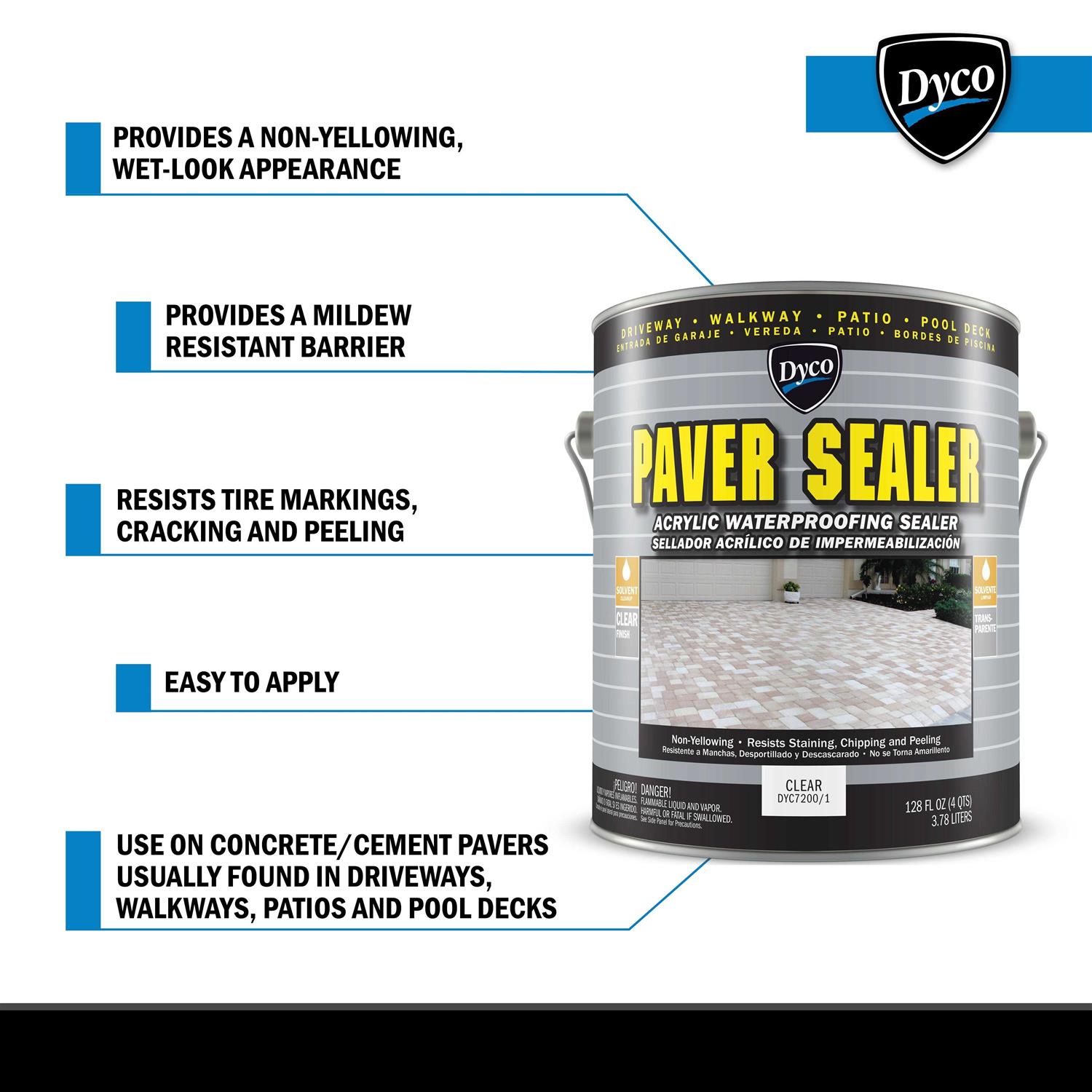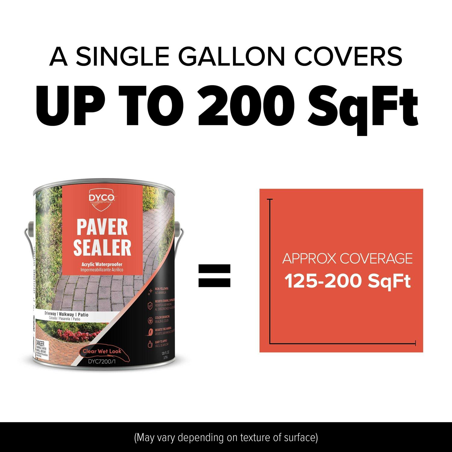 Dyco Commercial 7200 Cement Paver Sealer is a solvent acrylic, nonyellowing clear sealer for sealing non-sealed or coated pavers. Paver Sealer gives a wet-look and enhances the true color of the paver. How to determine if your pavers have been sealed with a latex water base sealer: Test the surfaces by pouring a small amount of water on the surface. If it penetrates quickly, the surface is porous and ready for 7200 Paver Sealer. If it does NOT and takes 2-20 minutes to penetrate, then DO NOT apply 7200 Paver Sealer.