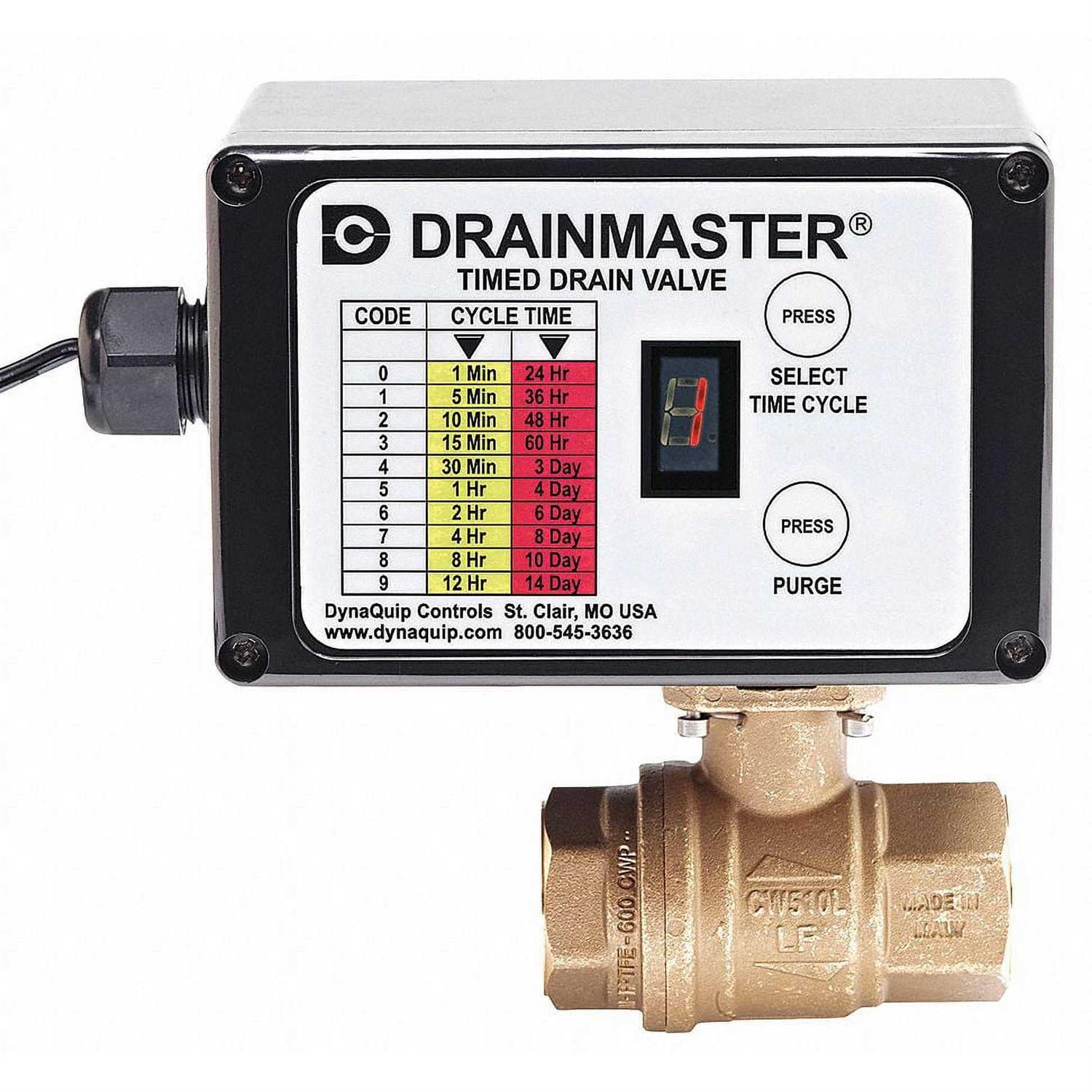 Timer-Operated electronic drain valve open an closes automatically based upon easy-to-adjust timer settings. This motorized ball valve is for use when contaminants and large particles may plug or hold open other drain valves.