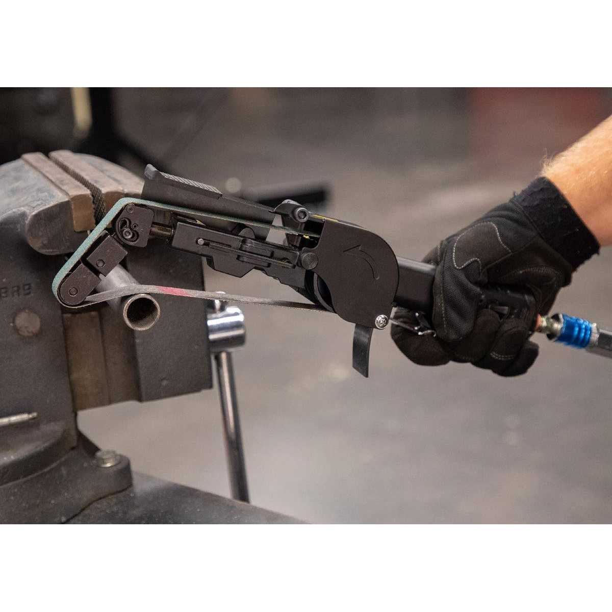 The Eastwood Pro Mini Angle Belt Sander Features: 3/4″ x 20.5″ Paper size for excellent paint removal, smoothing, and rust removal in limited space applications; Great for surface conditioning of tubes and rounded surfaces; Air outlet located in the back of the handle to direct exhaust air away from your work area; Quick change sanding belt replacement makes for high tool up time; Adjustable sanding arm provides increased versatility in low clearance situations;EASTWOOD PRO MINI ANGLE BELT SANDER 3/4″ X 20-1/2″ The Eastwood 3/4″ X 20-1/2″ Pro Mini Angle Belt Sander is compact and powerful with an adjustable angle and articulated sanding arm for ease in grinding and sanding in the most difficult to access areas. It features a sealed ball bearing drive assembly for smooth, low vibration operation and long life. The precision diecast housing provides a solid foundation and offers ergonomic, one handed operation controlled by a convenient handle mounted paddle trigger.