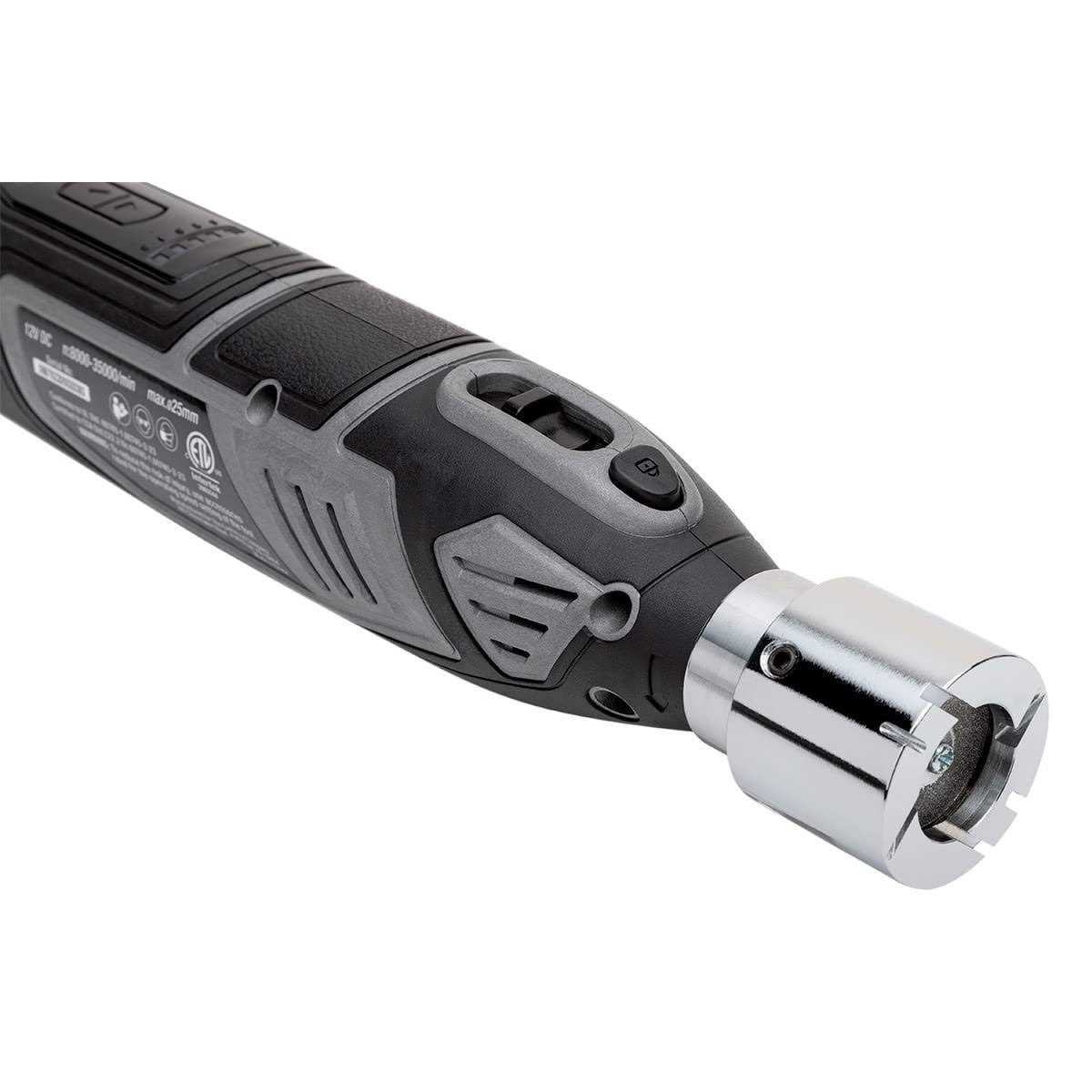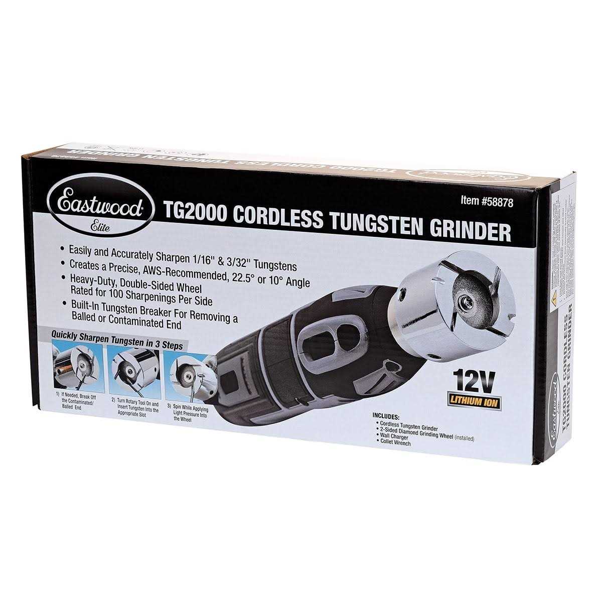 This Eastwood Cordless Tungsten Grinder features a long-lasting, double-sided, Diamond Grinding Wheel capable of providing over 200 tungsten sharpenings per wheel. Since it’s cordless and portable, you can keep it with you wherever you’re TIG welding and always have a perfectly ground tungsten for the best welds. The increased portability of the new Elite TG2000 Cordless Eastwood Tungsten Grinder eliminates getting out of position to go to your bench grinder, making it perfect when you’re under a car or in tight spaces like welding around a roll cage. The small handheld unit is right by your side wherever you are welding. The Eastwood tungsten grinder also has engineered slots that are designed to hold both 1/16 and 3/32 tungsten at the exact 10 or 22.5 degree angle for re-sharpening, assuring the perfect point every time! Simply remove the tungsten, place in the design slots and sharpen- its that easy. Specifications Collet
