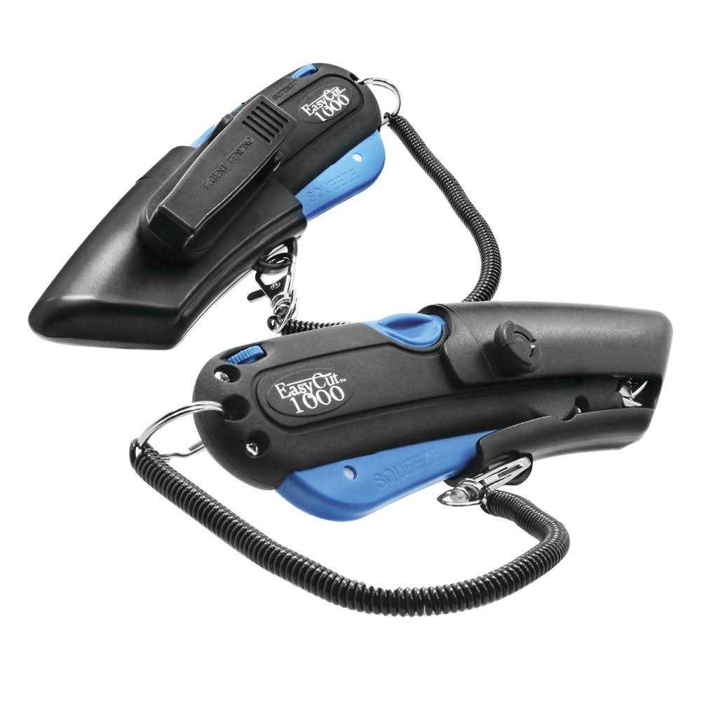 EASY-CUT 2000 have built-in multiple blade-depth settings with slightly increased blade length that makes cutting single, double, and triple walled corrugated cardboards and boxes a breeze with superb control and fluidity Even damaged and import boxes! A radius-blunt tip blade and integrated tape cutter makes EASY-CUT 2000 a world above its competitions! Designed with the user first, a gentle squeeze of its ergonomic handle extends the blade naturally. No need for continuous and repetitive thumbing action, thus greatly reduce the risk of injury that is common with other knives and box cutters. When the user is finished with cutting, simply release the handle, and the blade retracts automatically. Included in this set is an original clip-on holster and lanyard (stretches up to 6 feet!) with 360-degree rotation offers convenient and safe storage reducing injuries and down-time looking for lost cutters! The dual-sided edge guide enables left- and right-handed users to make quick, accurate top cuts, and slides back into locked position when the cut is complete. The on-board blade storage enables fast and tool-free blade changes. EASY-CUT 2000 is available in two vibrant colors that is easy to spot: Red and Yellow. EASY-CUT 1000 is available in three vibrant colors that is easy to spot: Orange, White, and Blue.