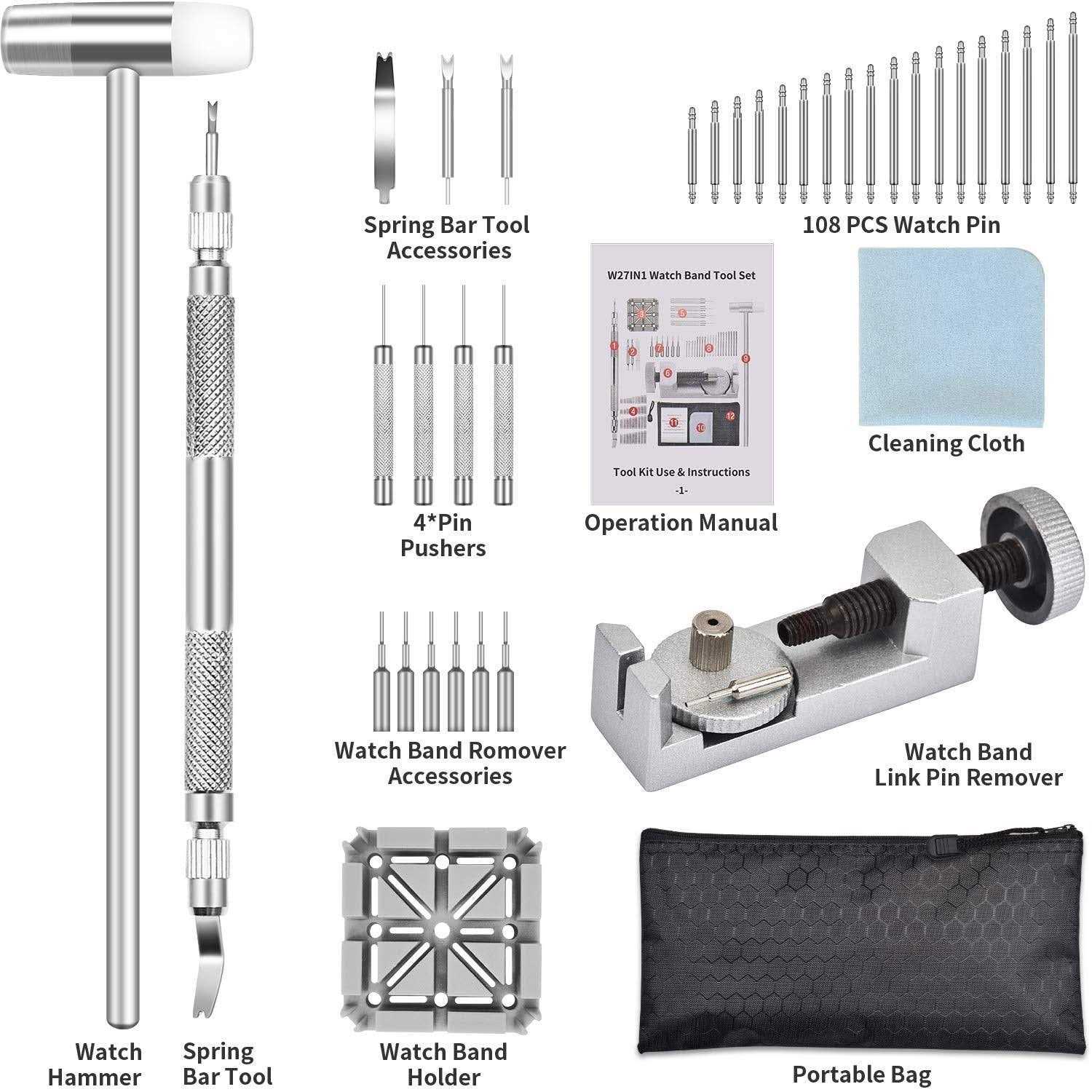 Professional Portfolio: The watch repair kit includes a spring bar with 3 extra tips, a watch link remover with 6 extra pins , a small hammer, a band holder and 4 punch pins for adjustment. It also comes with 108 spring bars, 20 links and a cleaning cloth, providing a comprehensive set for daily watch maintenance. Multi Ways to Adjust the Link: The watch tool kit offers versatile link adjustment with two removers and 6 sizes (20pcs) wtch links. Each remover can handle up to 1.18in wide bands nad remove 0.19om tjocl straps, facilitating link removal and length adjustment. Utilize the band holder, hammer, and punch pins for efficient link removeal and insertion. Ideal for Strap Replacement: The stainless bar tool,along with its tips, simplifies strap removal between the case the watch. It comes with 18 sizes of spring bars, 6 for each size, and 3 extra tooltips. This watch band tool is perfect for strap replacement. High Quality Material: Watch link remover, small hammer, spring bar, and watch links are made of rust-resistant, sturdy steel, strong and durable. The product is packed in a black nylon bag, compact and convenient. Easy to Use: The watch link remover kit comes with a printed user manual that can help beginners use this tool. Finish replacing your favorite strap at home, a simple tool effectively without wiggling.This watch link adjust tool will be a great gift for watch enthusiast and DIY person. EasyTime watches repair toolset is the perfect set for very common tasks like watchband adjustment, adjusting bands, and more. All-Metal Watch Band Link Remover: – Fits bands up to 30mm in width come with 3 extra Pins material: Steel – Spring Bar Tool Kit – Spring bar link pin remover with 6 extra tips for strap adjustment/replacement – Watch Band Holder – Dual Head Hammer – 3 Pin Punches – Watch pins (18 different sizes from 8mm to 25mm) Package Includes: – 1 * Watchband link remover with 6 extra pins – 1 * Spring bar tool with 3 replacement tips – 1 * Watch case holder – 1 * Dual head hammer – 3 * Punches – 1* bag of 108 pieces watch pins – 1 * Watch wipes cloth – 1 * Black zipper pouch