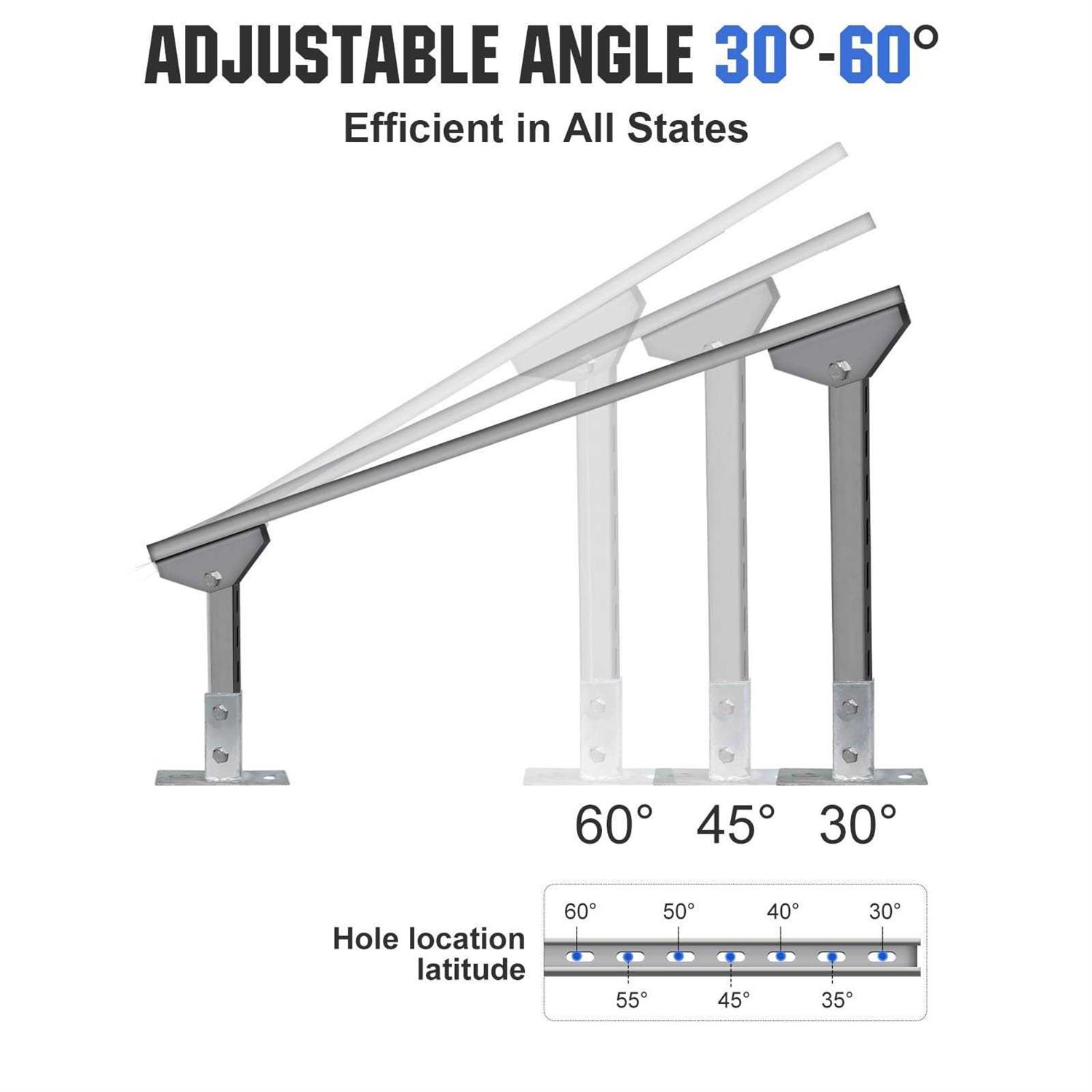 ECO-WORTHY Multi-Panels Mount has the capability to fit 1-4pcs different size ECO-WORTHY panels or other brands standard panels Galvanized Steel construction, sturdy and durable. You can put battery, controller, inverter at backside of the mounting system. It can save lots of room and use solar power system easier It’s ideal for larger installations, such as ground, open space, cabins and backyard sheds.Anywhere roof mounting is not a possibility, this solar panel mount can be applied Adjustable angle from 30° to 60° Degree, right angle for best solar power. Fixed on ground resistant wind and rain, well protect solar panel and easy to clean The Multi-Panel Mount is compatible with the ECO-WORTHY 100 Watts monocrystalline, and 120 Watts monocrystalline and 195 Watts solar panels Warm Tips /b br Please check your solar panel size before purchasing /b br About mounting total solar panel width is 107 inches /b br Installation angle: 30°degree Solar Panel length size max. is 55 inches. br 25°degree Solar Panel length size max. length is 65 inches. br 18°degree Solar Panel length size max. is 89 inches br Widely Use /b br You can put battery, controller, inverter at backside of the mounting system. It can save lots of room and use solar power system easier. br Add concrete/pole can make a solar power store house to in store things and use free solar power energy Package Includes /b br 7.84 inches C T-type Steel*2pcs br 19.68 inches C T-type Steel*2pcs br 39.37 inches C T-type Steel*2pcs br 12.79 inches C T-type Steel*2pcs br 57.08 inches C T-type Steel*4pcs br Connecting Bolt*4pcs br Edge Pressure*4pcs br Base*4pcs br Universal Joint*4pcs br Middle Pressure*6pcs br Inscribed Bolt*8pcs br Short Bolts*8pcs br End Cap*8pcs br Expansion Screw*8pcs br Long Bolts*12pcs br