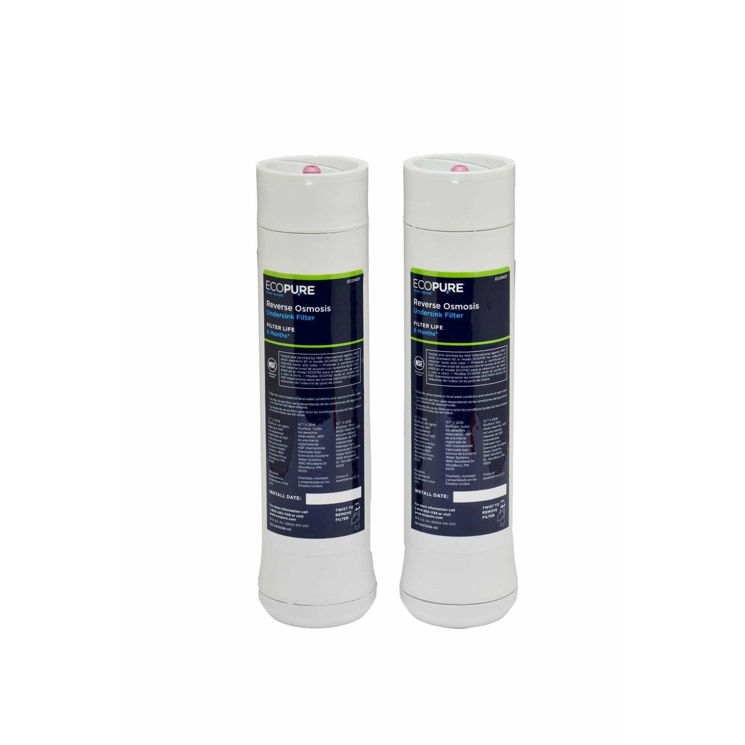 Compatible with our EcoPure ECOP30 system and Kenmore 42-38156 and 42-38556 systems, these replacement filters are stages one and three in the reverse osmosis filtration process. Together with the reverse osmosis membrane (ECOROM), these filters deliver the same level of filtration youd expect from companies that product bottled water, perfect for drinking, cooking, coffee and ice. Made using high-quality activated carbon block, the ECOROF filters feature a highly adsorptive, positively-charged material that removes greater amounts of impurities from your water than youd get with a sediment filter. These reverse osmosis filters are NSF certified to reduce numerous contaminants, including chlorine taste & odor, sediment, cysts, lead, dissolved solids, and chemicals, such as arsenic (pentavalent), barium, cadmium, chromium (Vl), chromium (III), copper, nitrate, nitrite, radium, selenium, fluoride, turbidity, ammonium, bicarbonate, bromide, chloride, magnesium, sodium, sulfate, tannin, and zinc. The reverse osmosis filters are part of a 3-stage RO system, because when it comes to high-quality, great-tasting drinking water, 3 stages are all you need. Competitive RO systems with 5 or 6 stages dont mean cleaner water, they simply mean youll be spending more on replacing ALL those filters. Furthermore, EcoPures encapsulated water filter design means filter changes are quick and mess-free. In just a few minutes, you can twist off the old water filters and twist on the new ones. No tools required, no need to shut off your water supply, and no touching dirty, contaminated filtersits that easy! To ensure your reverse osmosis system is providing the highest quality water for your home, change your filters every 6 months, as recommended.