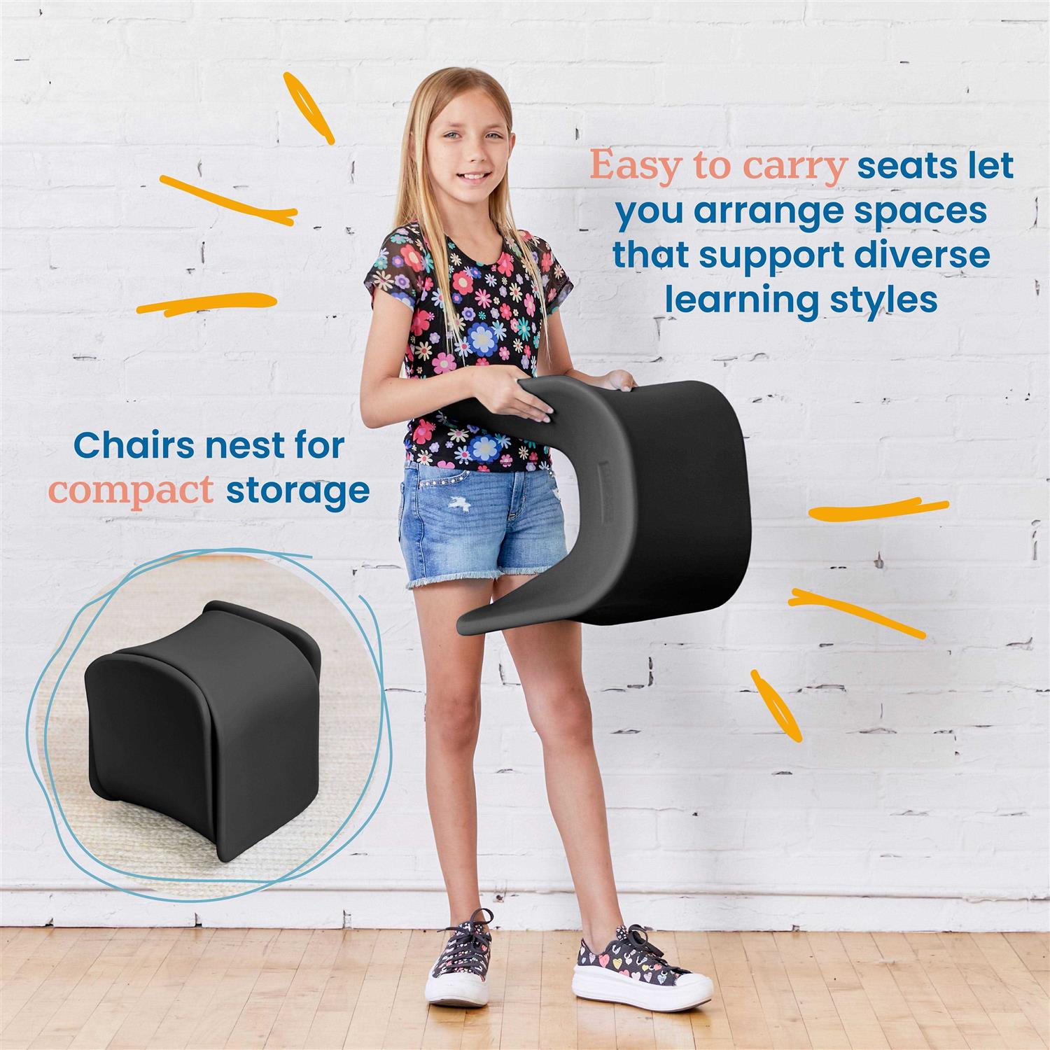 The Wave Seat is a fun multi-positional chair to rock, perch or sit. This two-pack of stools grows with you for use with young children to adults. The active core engagement stool evolves from an assisted rocker for little ones, to a saddle-style seat with wobble base, to a perch seat, and full seating surface. The forward seat angle keeps legs engaged for active seating that supports upright posture and alertness. These chairs are intentionally designed for shorter periods of sitting, perfect for high-traffic spaces like libraries, common areas, outdoor classrooms, and places for quick conversations. Designed for everyday use in schools, homes or offices, these lightweight stools let you quickly rearrange workspaces. Easily circle up for discussions or pair with activity tables and desks for individual and collaborative work. Creative classroom seating supports different learning styles and empowers both students and teachers. These flexible seats provide freedom to move making it the perfect grab-and-go stool for taking the classroom indoors and out. When learning time is over, two seats nest together for compact storage to save valuable floor space. The streamlined one-piece plastic design features rounded edges and no hard corners for safety, comes fully assembled and is maintenance-free.