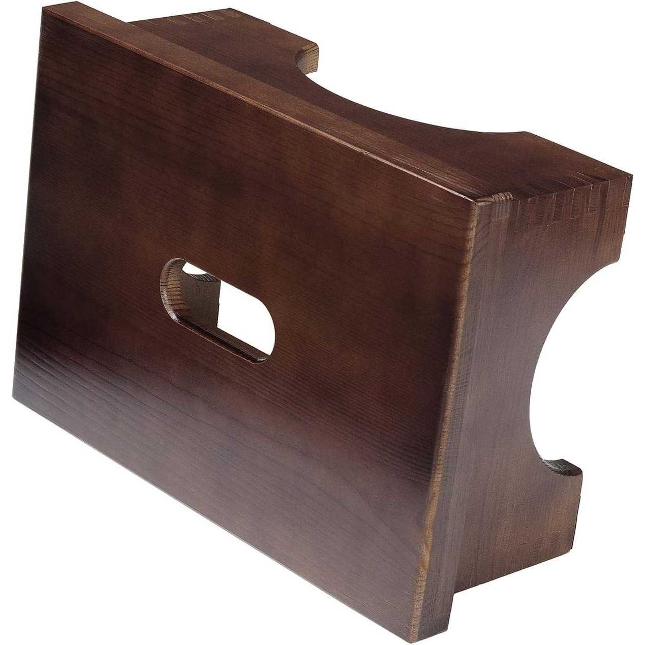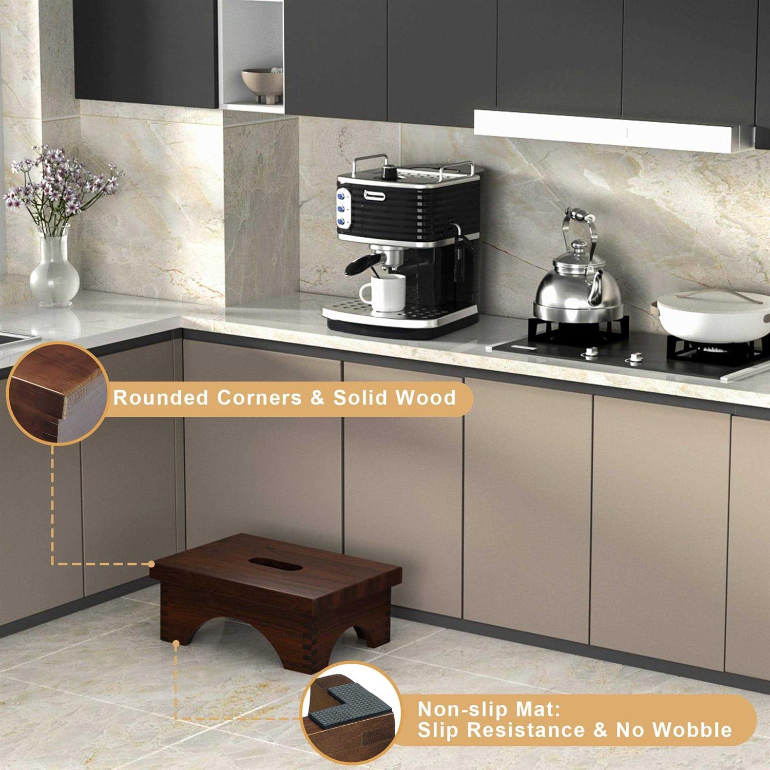 The entire bedside stepping stool made of 100% solid wood, surface printed with varnish Smooth surface, rounded corners, solid wood material weight makes it stands steadily Dark Walnut Color; Size: 16.5”L x 11.8”W x 6.3”H, tall enough to help get into high bed or support to reach to a higher countertop Special Design Easy to Carry, portable one step stool is sturdy enough to support adults and safe enough for kids, about 400 Pound Capacity Great ideal solid stepping stool for seniors, toddlers, pets adults, kids and etc. Perfect helping step stool furniture for bedroom, kitchen, bathroom, garden etc.