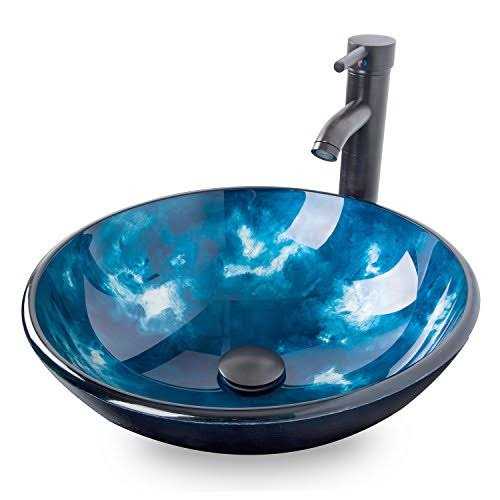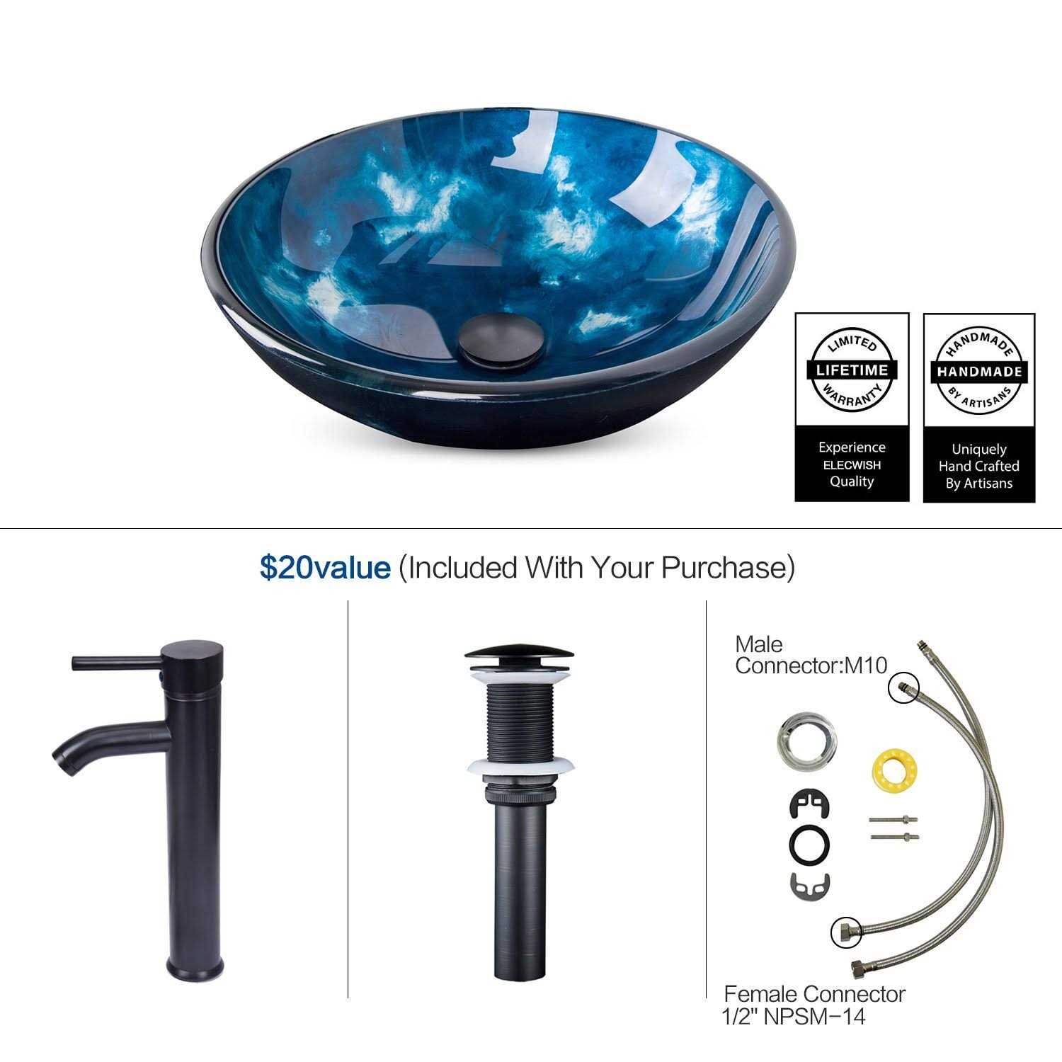 ELECWISH Bathroom Artistic Vessel Sink Round Above Tempered Glass Faucet & Pop up Drain