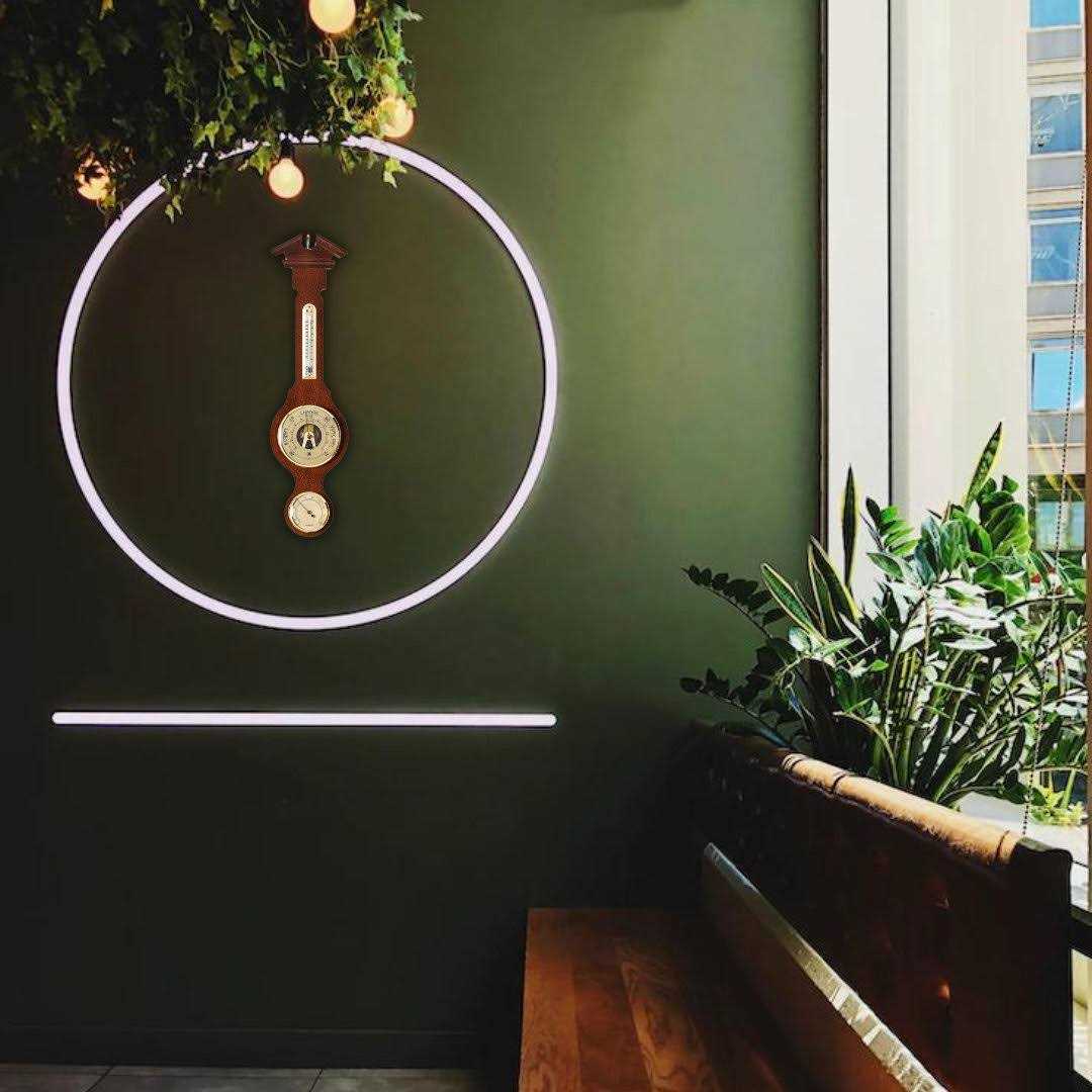 Features: -German movement. -Material: Walnut wood. -Barometer. -Thermometer. -Hygrometer. -Banjo weather station. Product Type: -Thermometer/Barometer/Weather Station/Hygrometer. Subject: -Nautical. Dimensions: Overall Height – Top to Bottom: -20 inch. Overall Width – Side to Side: -5 inch. Overall Depth – Front to Back: -1.25 inch. Overall Product Weight: -1.80 lbs.
