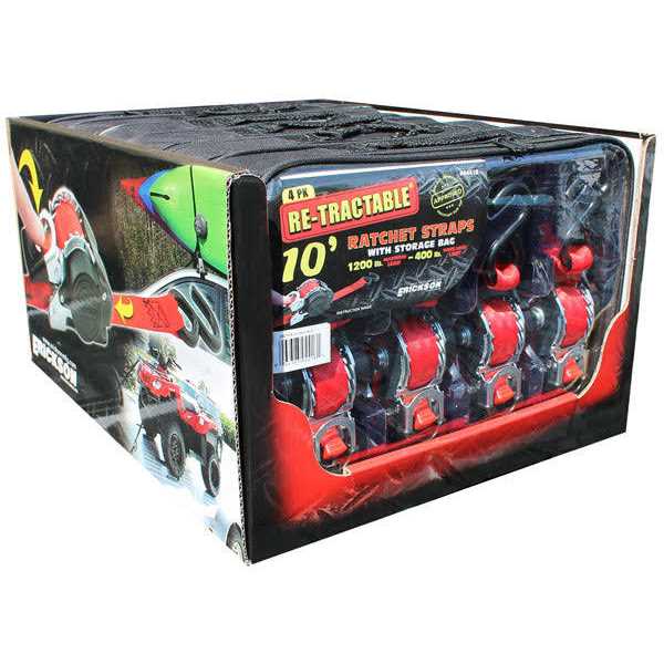 Feature the product Storage bag with zipper keeps straps organized when not in use Re-Tractable ratcheting system is simple and smart Unused web is stored in center so it does not flap in wind or get dirty Contains four 1″ x 10′ long, red webbed, durable straps 1200 lbs load capacity and 400 lbs working load limit Erickson 04418 contains four (4) professional series 10′ red retractable ratcheting tie-downs in a reusable storage bag with zipper. tie-downs in a reusable storage bag with zipper. Erickson’s new patented design is the next step up in the tie-down industry. The retractables are so simple to operate – simply pull the web out to the desired length and start ratcheting until tight. To release, simply push down on the red release button. The web not being used is stored in the center housing so you have no web blowing in the wind. This feature also keeps the straps clean and free from oil and dirt. Each strap is 1 inch wide by 10 feet long, 1200 pounds load capacity, 400 pounds WLL (working load limit). Erickson manufacturing has been producing tie-down straps and related products for over 25 years. As a leading manufacturer of tie-down and towing products in north America, Erickson manufacturing strives to provide the safest products available with the consumer in mind.