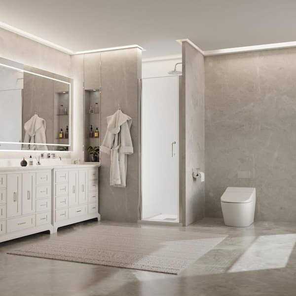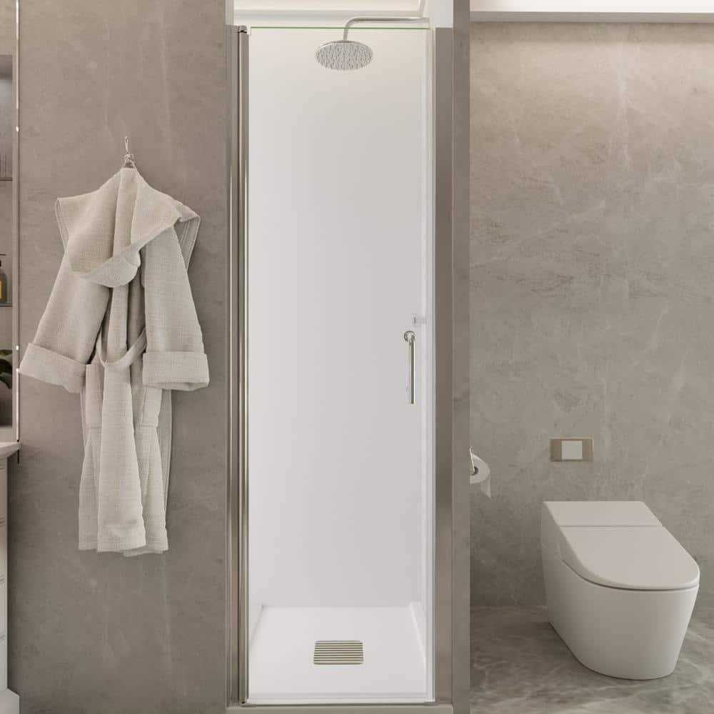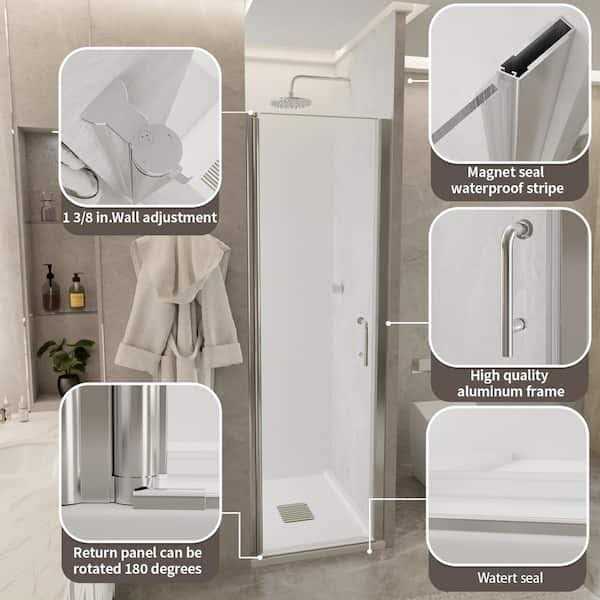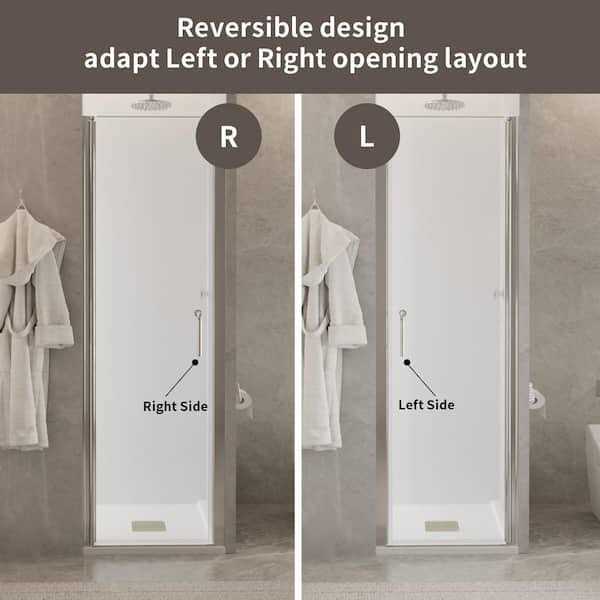Expertly created to fulfill the requirements of contemporary design is the ES-DIY Semi frameless hinged pivot shower door. Made of thick, tempered 1/4 in. (6 mm) ANSI Z97.1 clear tempered glass with a professionally applied water-repellent, sanitary, and stain-resistant glass coating, it has a single-panel hinged design that is 72 in. Tall. The ES-DIY pivot shower door is available in a variety of widths and hardware finishes to perfectly match the decor of your bathroom. With vertical shower handles to make stepping into and out of the shower simple, it is designed to be installed both left- and right-handed.