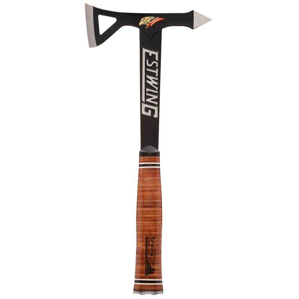 Tomahawk axeNylon Vinyl Shock Reduction Grip#174; with leather grip16.25 overall length27 ozAmerican-made Leather Black Eagle Tomahawk Axe is designed for sportsmen and military professionals. The lightweight design makes it easy to carry and with Estwing’s Shock Reduction Grip for comfort and durability. The Leather Black Eagle Tomahawk isperfectly balanced and weighted, and made to last, with a genuine leather grip. American forged in one piece out of genuine American steel.