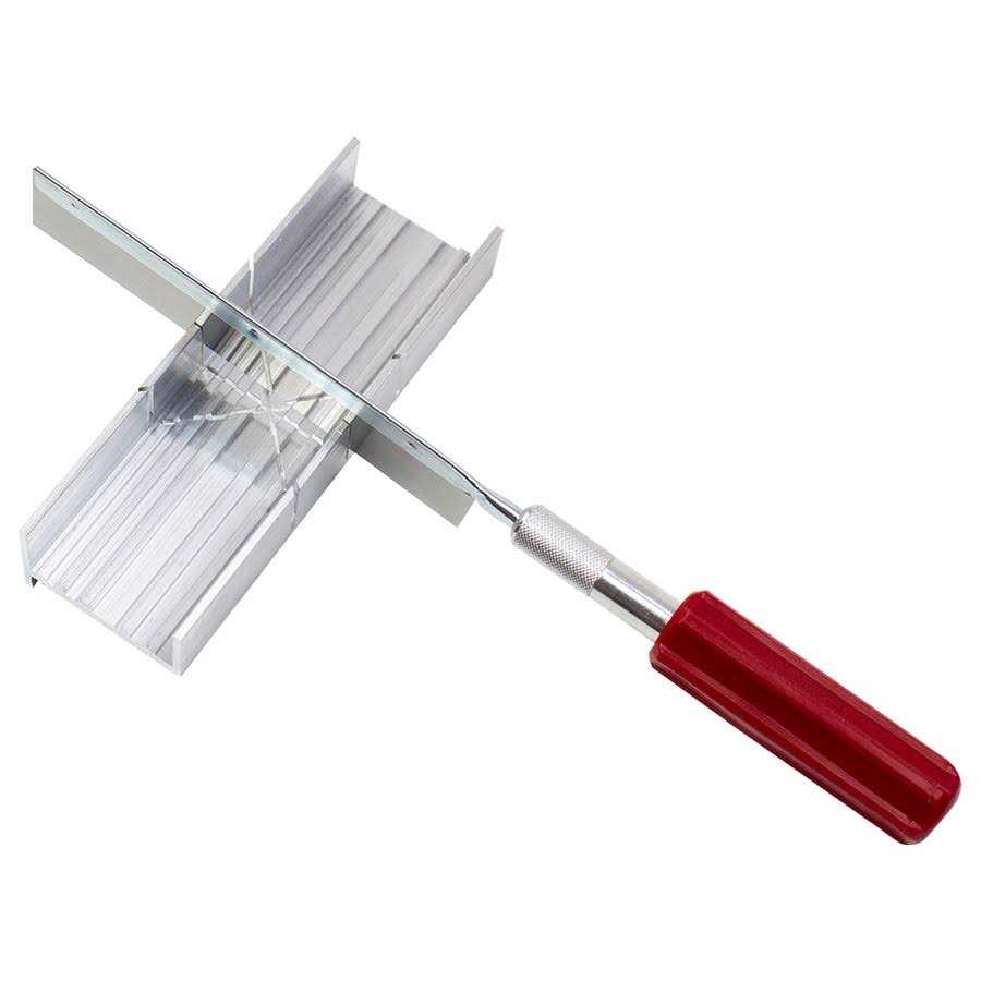 Excel aluminum mitre box is just 6″ long, making it ideal for miniature work. Each unit has two 45 degree and one 90 degree cutting slots. Heavy duty Red plastic saw handle with 7/16″ aluminum adapter and 4-jaw machined aluminum chuck for secure blade positioning. Saw blade is 1-1/4″ deep, 5″ long with 54 teeth per inch for smooth cutting of balsa wood, plastic and thin metal, 12 material thickness. Carded packaging.