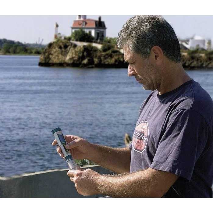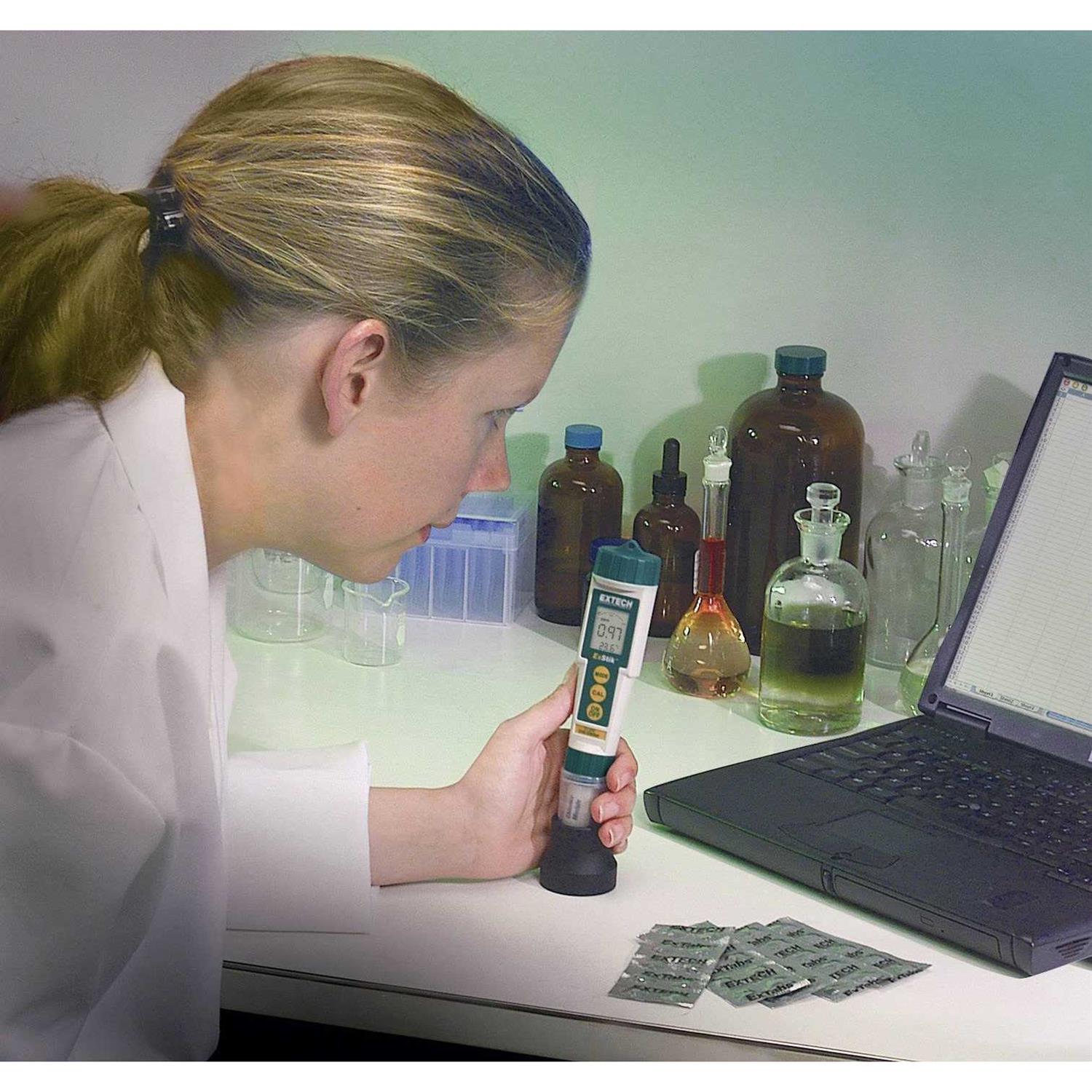 The waterproof ExStik PH100 pH meter by Extech is an accurate, rugged and reusable stick pH meter with some unique data storage features that make it exceptionally easy to use and considerably enhance its usability. The flat surface electrode allows you to measure pH in liquids, semi-solids and solids and limits electrode breakage and clogged junctions. The Renew indicator tells you when it’s time to replace your electrode. The CAL alert ensures consistently accurate readings by telling you when you need to recalibrate. A Memory feature records and recalls 15 sequentially tagged readings, so you will know how your readings have changed over time. The LCD readout displays pH, temperature and an analog bargraph that shows trends in acidity or alkalinity and indicates when the reading is stable. 1, 2 or 3 point calibration automatically recognizes buffer solutions. Other features include automatic temperature compensation, auto power off, low battery indicator and data hold. The PH100 comes with a protective sensor cap, sample cup, four 3V CR2032 button batteries and a 48 in. (1.2 m) neck strap. For more convenience, purchase the EX006 weighted base, which holds both the sample cup and ExStik meter.