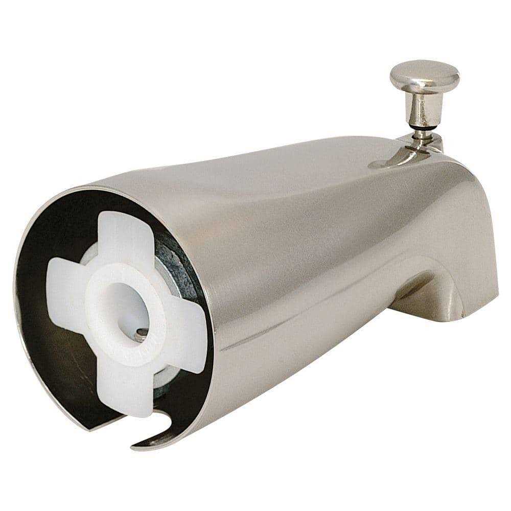 This slide-on diverter spout features a universal design that is compatible with a variety of decorating styles. This spout is great for replacement and remodeling applications or new installations. The spout is built with zinc with a brushed nickel finish for durability and corrosion resistance. This slide-on diverter spout features a universal design that is compatible with a variety of decorating styles. This spout is great for replacement and remodeling applications or new installations. The spout is built with zinc with a brushed nickel finish for durability and corrosion resistance. It is designed to be installed on a 1/2-inch copper tube that slides into place, the set screw is tightened to keep it in place.