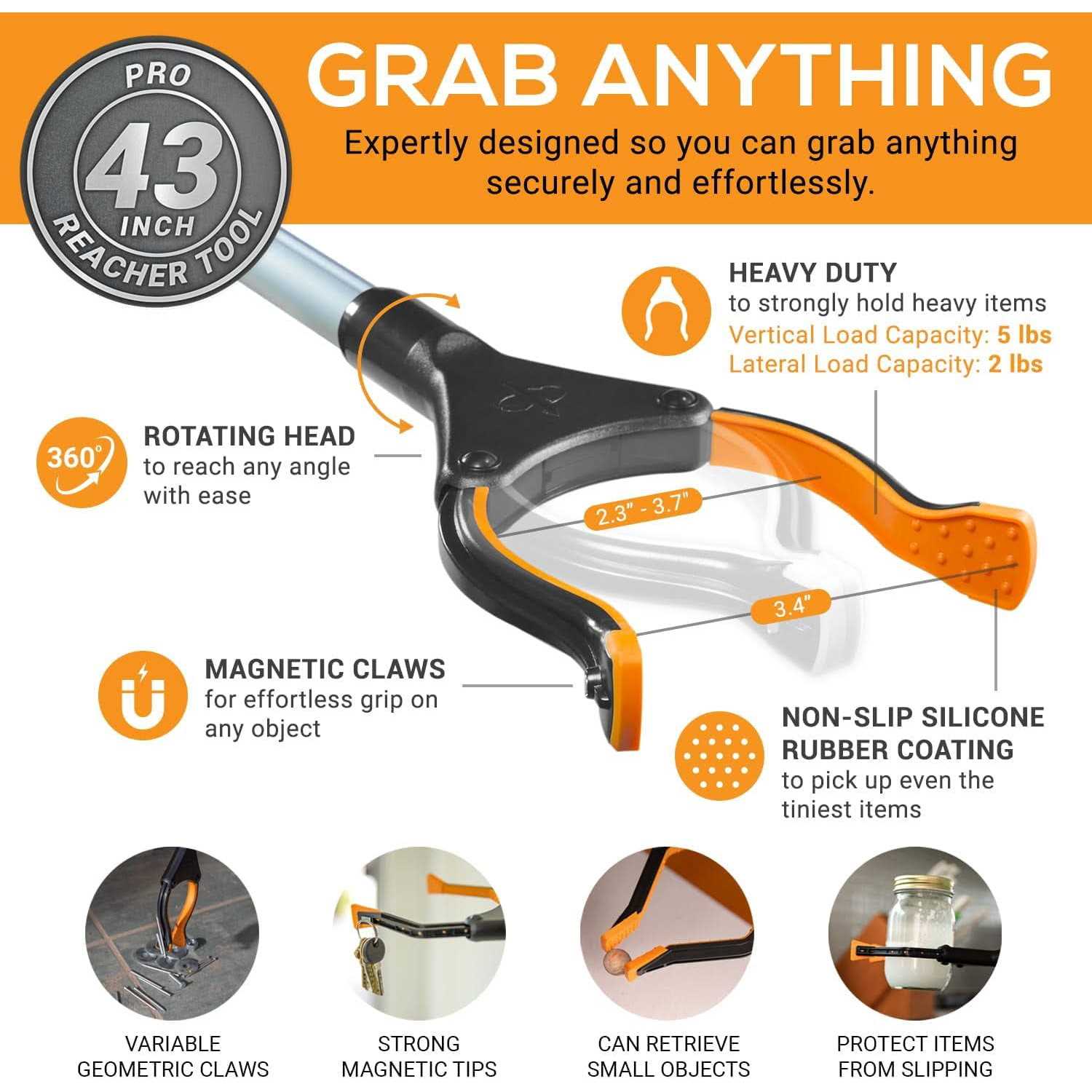 Make your life a little easier, especially if you have mobility issues, with this EZPIK heavy-duty grabber tool, which allows you to pick items without straining. It has wide claws that allow you to hold large items like bottles. This orange grabber reaching tool has 2 sturdy patented hinges and latches and can withstand loads of up to 5 lbs vertically and 2 lbs horizontally. It its aluminum alloy tubes are lightweight, allowing you to reach items in high places without straining your arm. The trash picker grabber tool also has an ergonomic design for easy handling and can fold so you can carry or store it. The silicone rubber coating on the claws ensures the grippers’ durability and provides a secure grip on items. Two powerful magnets on the claws of this long-reach grabber allow you to pick up small metallic objects like keys and batteries. Tool to collect litter & trash. Picker upper grabber for heavy duty cleaning ops like river banks Rotating Long Grabber. Reacher tool with rotating grippers for reaching narrow spaces Prevents strain on your wrist Foldable Disability Grabber. Must haves after knee surgery or hip replacement. Recovery kit gift to improve mobility Lightweight Arm Extender. Grabber rubberized claws prevent hazard to your hand. Grabber for reaching high shelves safely Magnetic Claw Grabber. Pickup tool grabber with magnets in the tips to catch small metallic items like nails, needles.