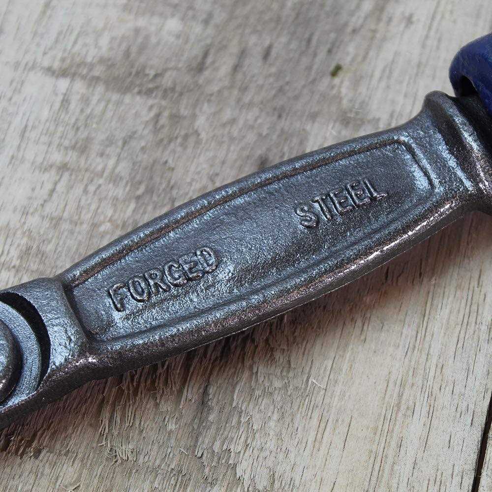 - Features a malleable cast iron slide handle with a hinged, drop-forged gripping jaw fixed to a box joint for extra strength