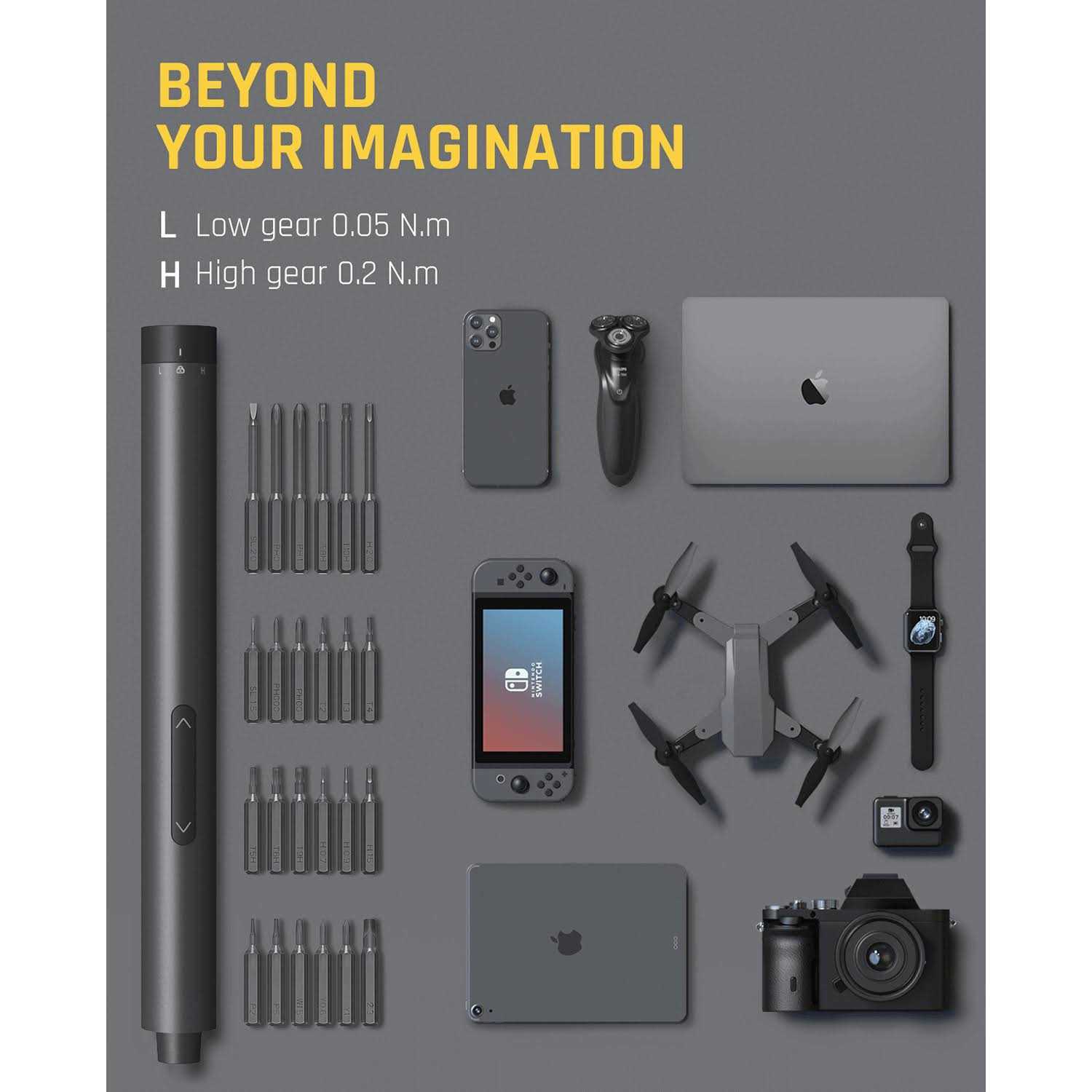 Equipped with a high-torque of 0.2 Nm and a low-torque of 0.05 Nm, as well as a manual torque of 3 Nm, this delicate electric screwdriver offers accurate torque forces for your handy work needs. 50 Magnetic Precision Bits and 2 Gears Torque, which is ideal for tablet computers, mobile phones, watches, electronic bracelets, cameras, precision instruments, etc.