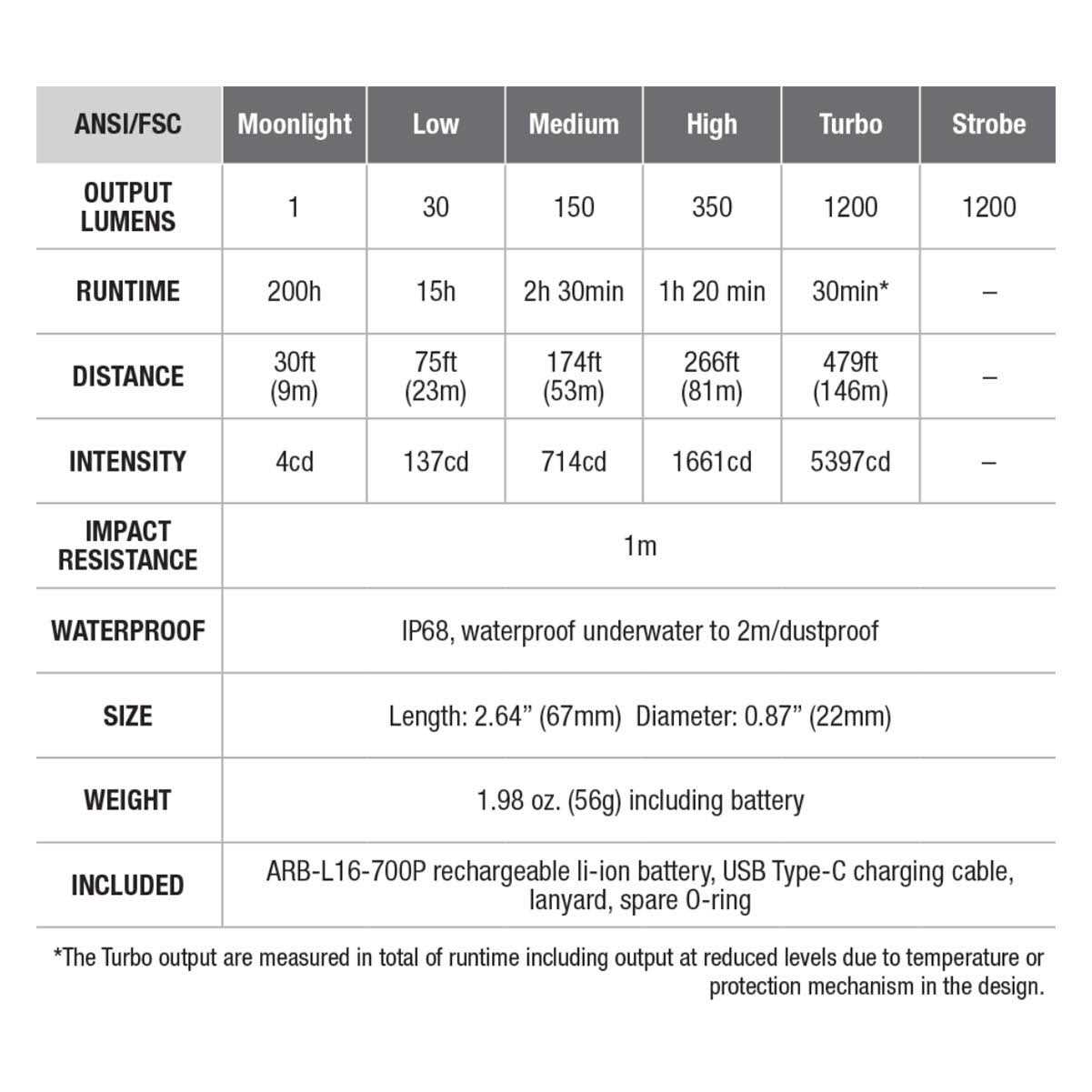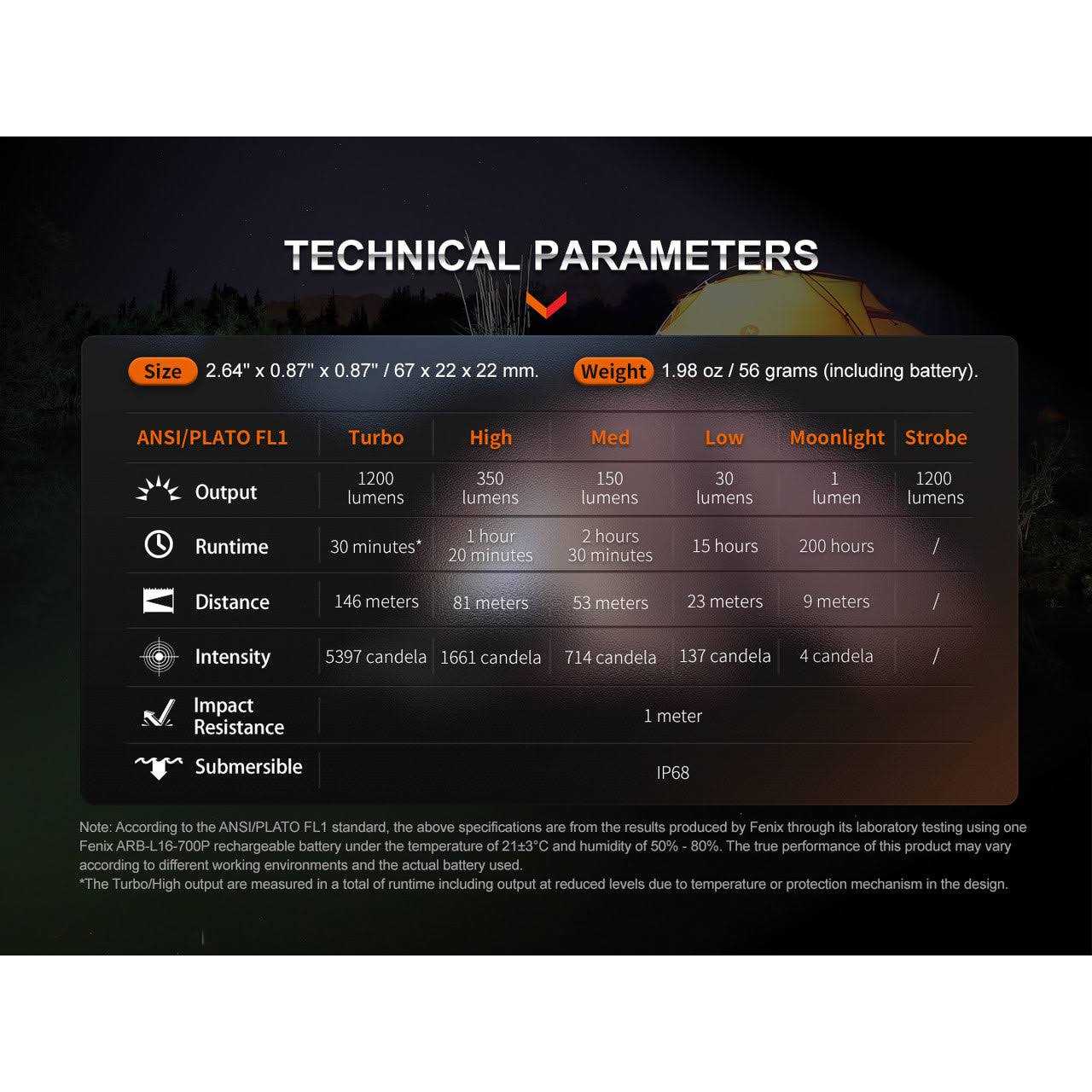 • Uses a Fenix ARB-L16-700P 16340 battery