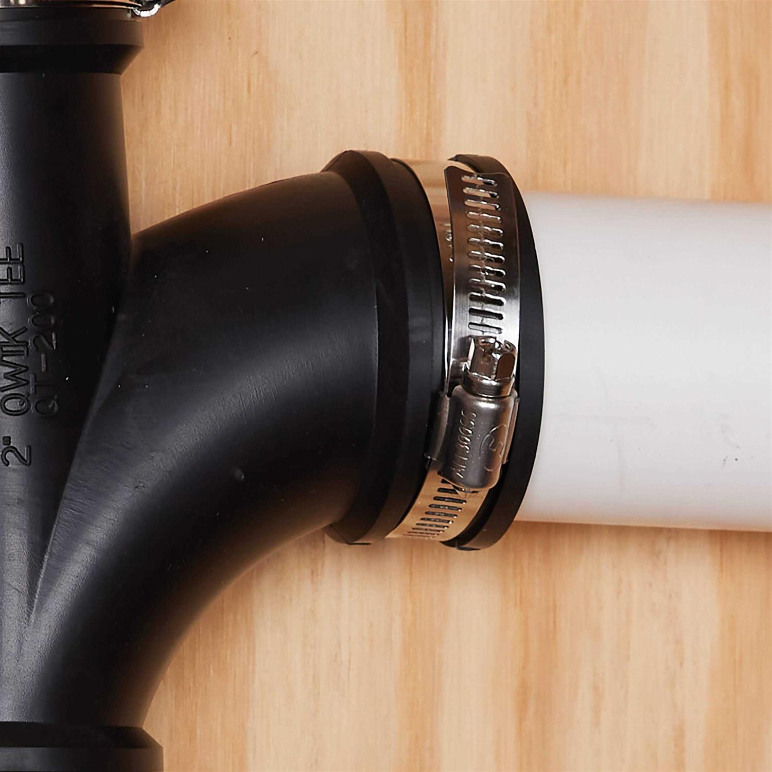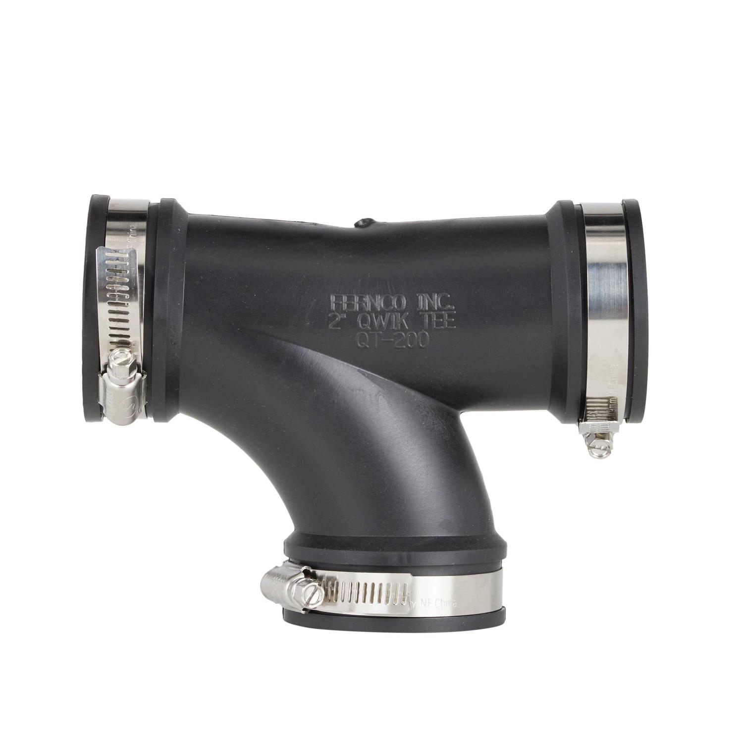 Flexible tees size 2 inches Allows for alteration or replacement of drain waste or vent fittings. Each fitting supplied with series 300 stainless steel clamps. Fits all common household pipes including cast iron, plastic, copper and lead. Exceptionally flexible and extra long. Ideal for replacement for fittings cut out at the joint during alteration or repair. NOTE: Not recommended for underground connections. For drain waste and vent use only. In-wall pipe should be supported. Do not use in pressure applications. Tee and elbows ada pt to other pipe sizes with Qwik Bushings.