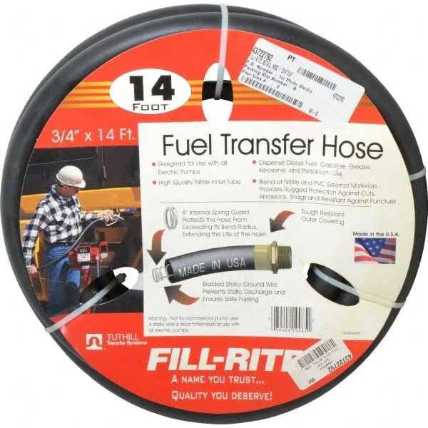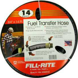 Fuel by Fill-Rite. Details:Use the Fill-Rite 3/4-inch Hose to transfer fuel with ease and speed. Constructed with an internal spring guard, this fuel transfer hose resists kinking for simple flow. The neoprene outer and nitrile inner tube are fuel resistant and durable. A stainless steel ground wire lessens the chance of a sparking accident. This fuel transfer hose is designed to be used with any electric fuel transfer pump, and is compatible with gasoline, diesel, biodiesel up to B20, ethanol up to E15, kerosene, and mineral spirits. The 3/4-inch male NPT fittings attach easily and securely. For dependable transfer of many types of fuel, use the Fill-Rite 14-Foot-Long Neoprene Fuel Transfer Hose.
