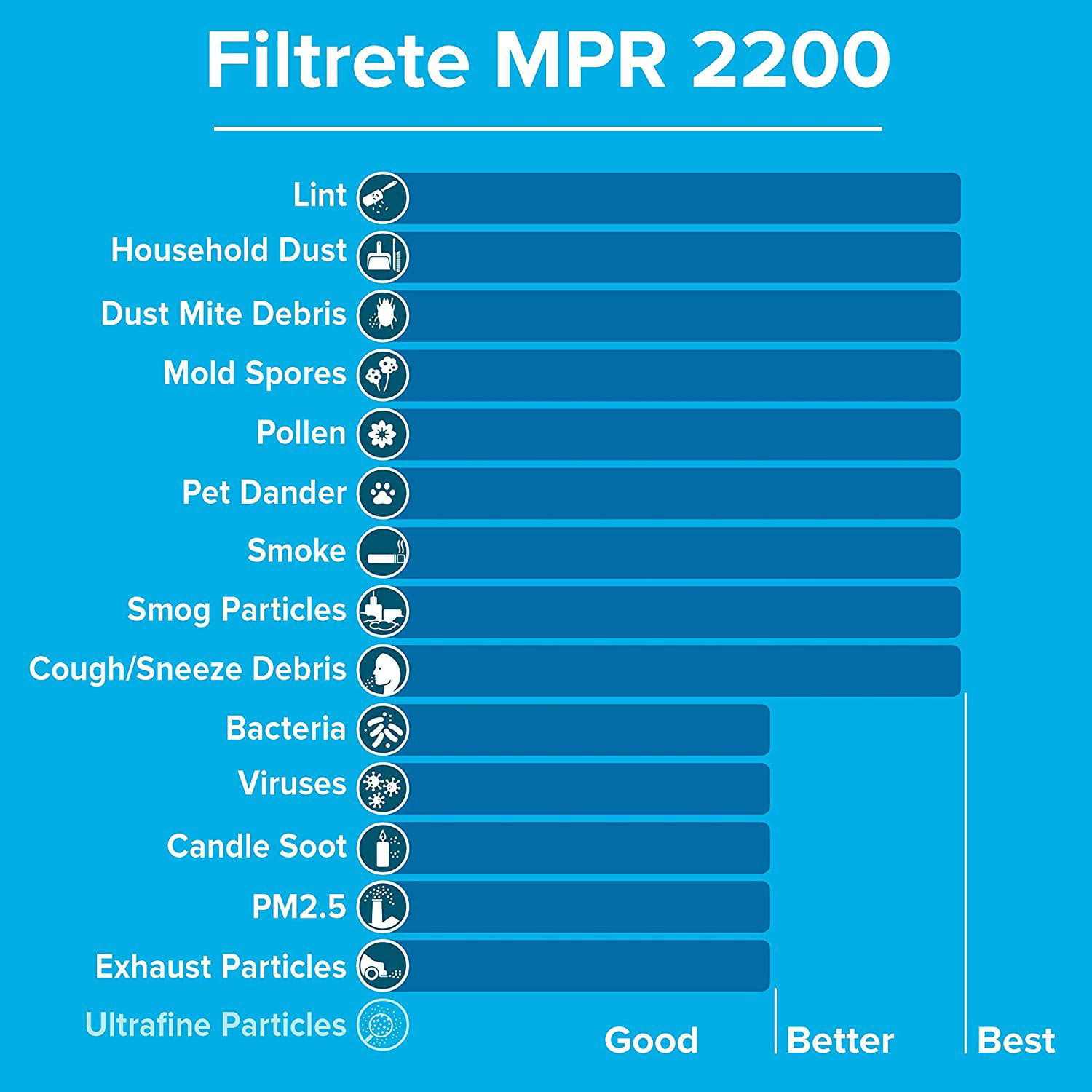 - Filtrete 2200 MPR (Microparticle Performance Rating) equates to MERV 13.