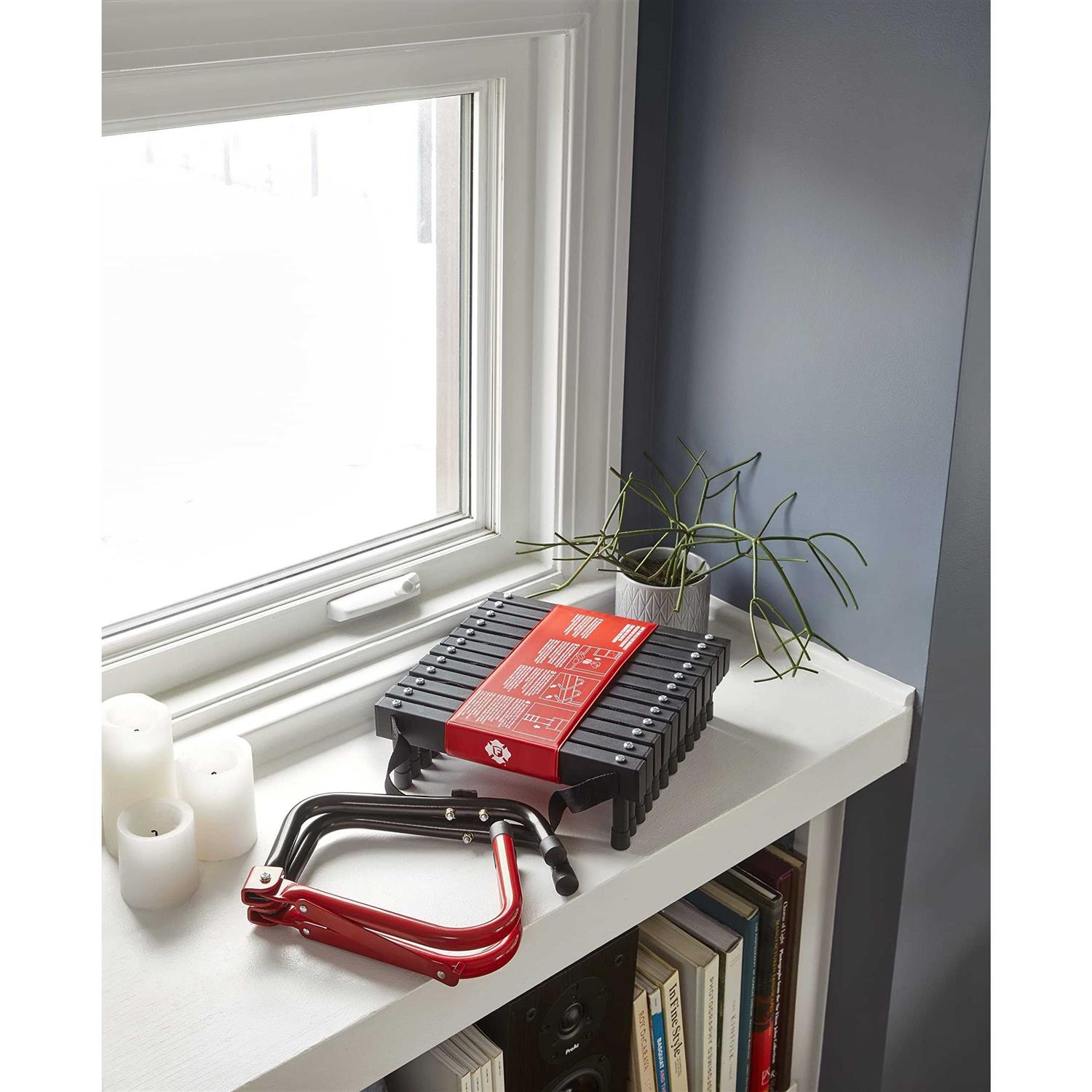 Two-story 15 ft long fully assembled escape ladder. Strong steel construction Large hooks secure easily to windowsills. Slip-resistant epoxy-coated rungs. 1000 lb overall strength, 350 lb individual rung strength. Fire safety ladder is 14 ft long, ideal for a two-story home or apartment. Fire safety ladder is 14 ft long, ideal for a two-story home or apartment. Durable steel and nylon construction, tested to 1125 lb. Steel stabilizers hold the ladder away from the wall for quick exit to safety. Ladder comes fully assembled and folds easily for storage. Designed for window sills between 6 and 10 in wide. Built for durability. Provides a stable climb down. The fire safety ladder can be used on standard window sills, stored under a bed or in a closet for easy access and comes fully assembled.