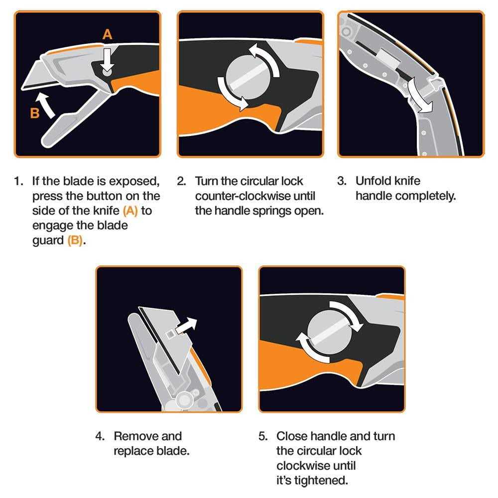 - The Fiskars Pro Fixed Utility Knife’s folding blade guard deploys with the push of a button for convenient, easy protection