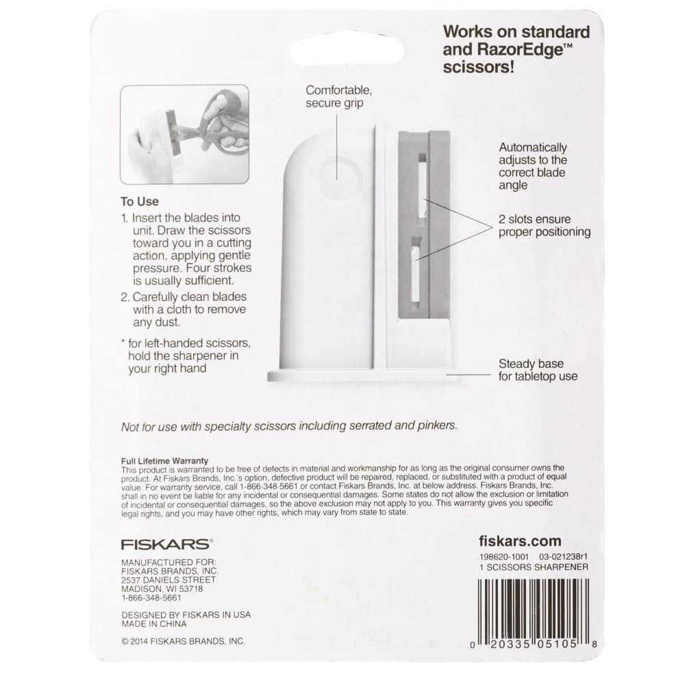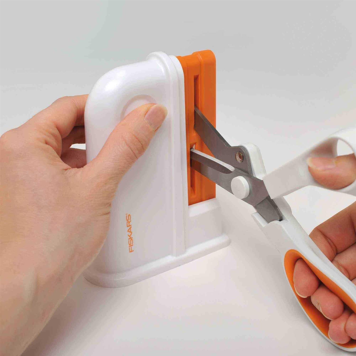 Shears sharpener universal 198620-1012 -old# 98617397j-. The Fiskars 98617397J Scissors Sharpener Machine provides an easy-to-handle and easy-to-store solution for sharpening old, dull scissors. Ideal for industries that need to cut through tough items on a daily basis, this scissors sharpener restores a sharp edge to your scissors in just a few swipes. The newly sharpened scissor edge will allow you to slice through life with ease. The lightweight Fiskars scissor sharpener is compact enough to fit in a kitchen drawer for easily accessibility. The sharpener is easy enough for use by anyone, getting blades sharp with little effort. The sharpener should only be used for right-handed scissors that do not have serrated or razor edges. Sharpeners scissors with ease. Lightweight design doesnt take up much space. Revitalize old, dull scissors that have seen too much use. Easy to use because sharpener positions scissors just right for optimal sharpening. Four to five strokes are all it takes to sharpen a pair of scissors.