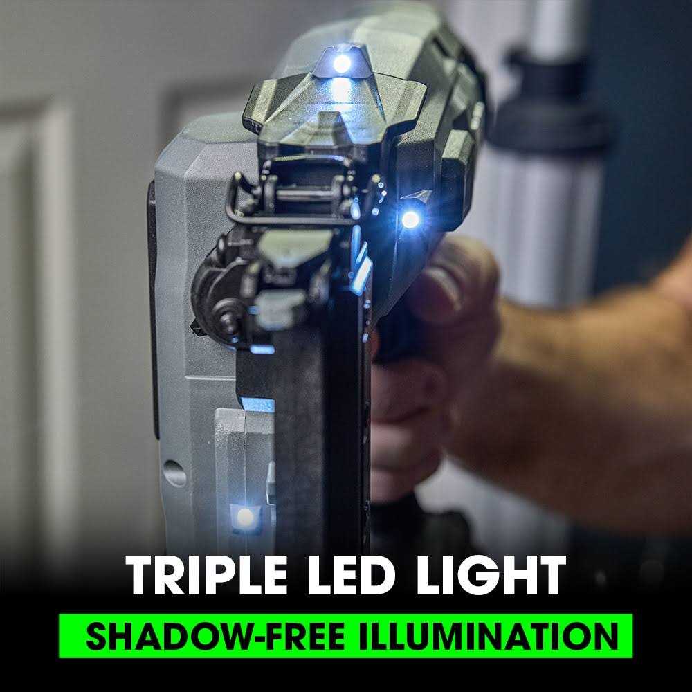 - Ergonomic lever easily sets ideal nailing depth TRIPLE LED LIGHT