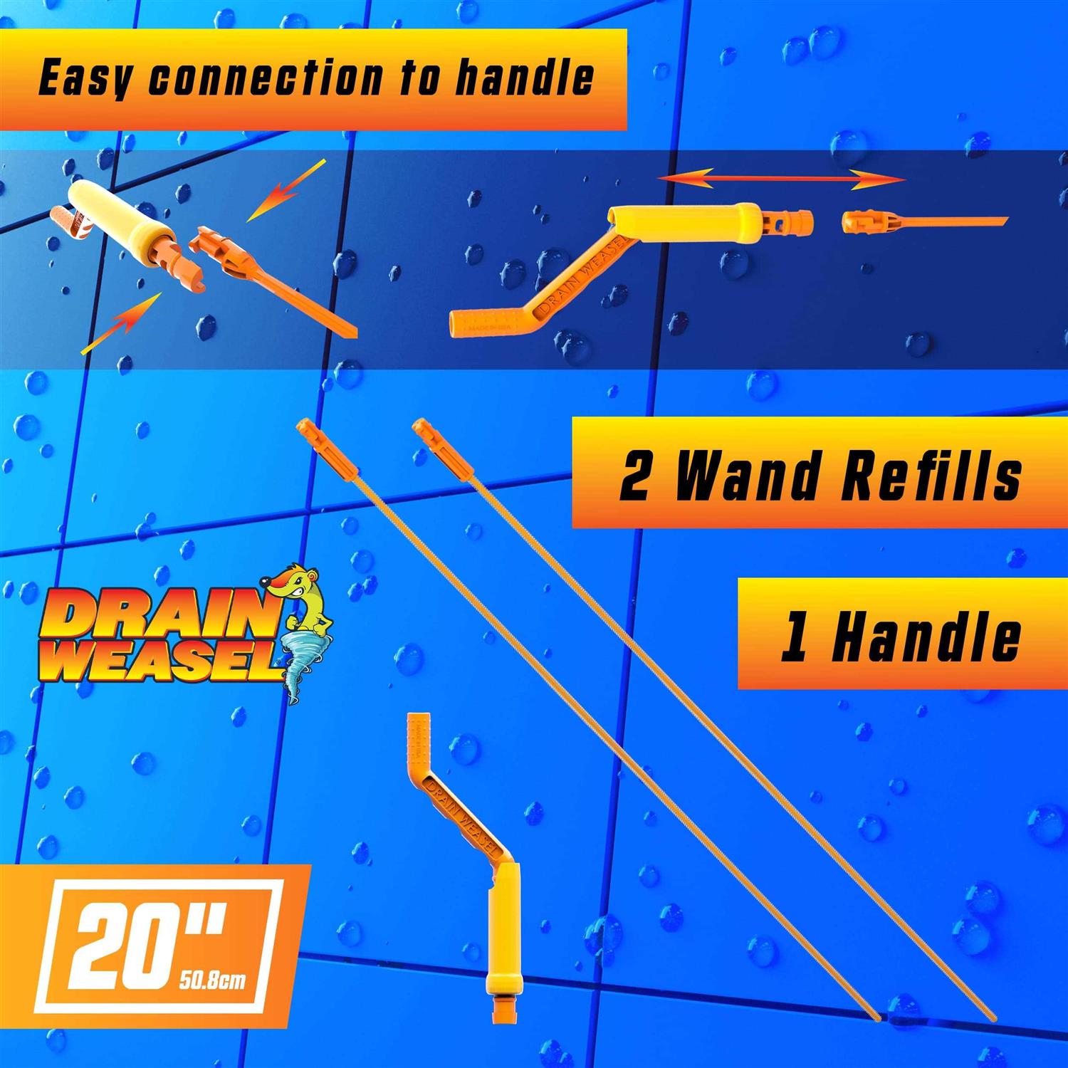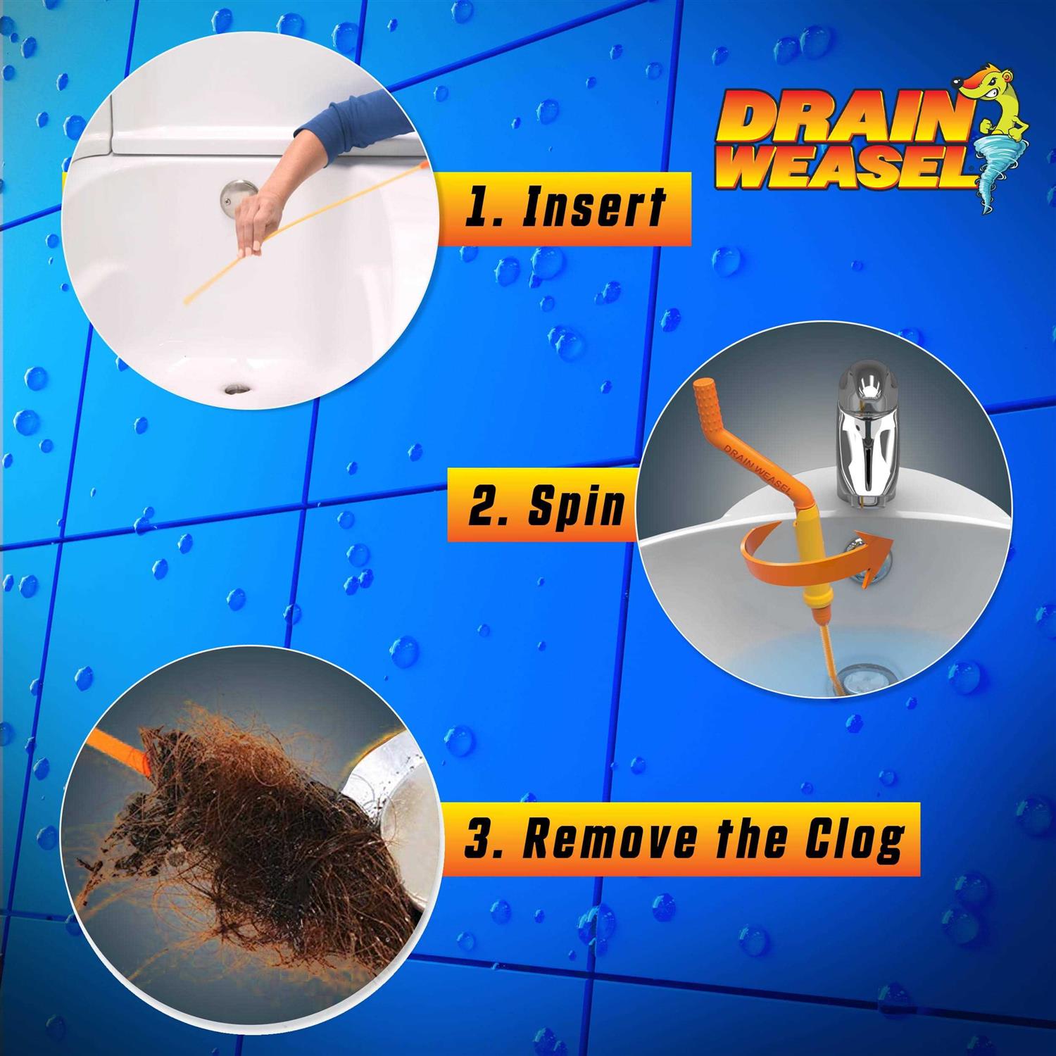 UNBLOCK CLOGGED DRAINS FAST – Say goodbye to pesky hair clogs that block your sinks, showers, and tubs. Let our Drain Weasel drain cleaner take the stage by promptly eliminating hair clogs, and removing hair, film, and grime instantly. PATENTED DESIGN – With a distinctive 360° rotation, the impossible now becomes achievable with our 20-inch long drain snake cleaner. Featuring patented micro-hooks, it locks into hair, filth, and grime without damaging your pipes or catching on drain parts. PULL THE GUNK OUT INSTANTLY – Never again do you need to go through the hassle of dismantling your drain pipes to unclog them. The Drain Weasel drain pipe cleaner pulls out the gunk to have your drain up and running in no time. DISPOSABLE WANDS FOR EASY CLEAN UP – No need to clean – just dispose of used wands effortlessly. Our plumbing snake drain cleaner hair clog remover includes 2 convenient wand refills in each pack and a reusable “Quick-Connect” handle for a seamless cleaning. EASY TO USE – The best part of our drain snake clog remover? You don’t need to be a plumbing expert to use it! With just three easy steps, your drain will be free-flowing in no time. First, insert the wand, then rotate the handle, and finally, remove the clog.