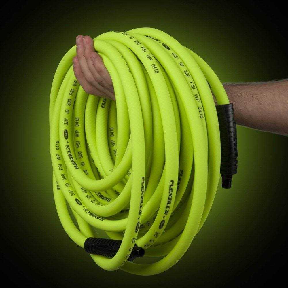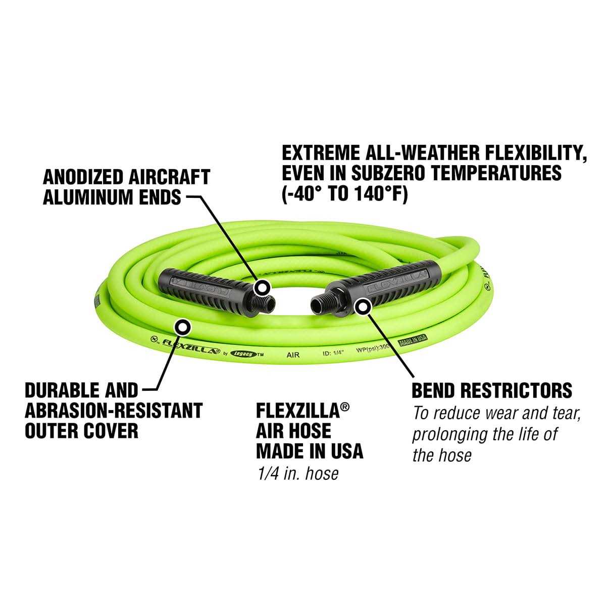 This item is a new Flexzilla premium hybrid polymer bright green air hose 1/4 x 25 with 1/4 male NPT ends and bend restrictors. Flexzilla air hose is made by Legacy Manufacturing and is a premium hybrid polymer that is superior to rubber or PVC air hose. It has extreme all-weather flexibility with any temperature between -40 degrees to 150 degrees Fahrenheit. It also features a 300 psi working pressure abrasion-resistant outer cover excellent bend radius kink-resistant under pressure lightweight.