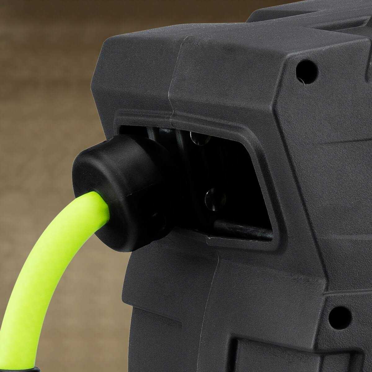 - Reel will automatically lock hose in place at any length wherever you stop IMPACT RESISTANT HOUSING SPEED CONTROL DEVICE AND ADJUSTABLE HOSE STOPPER